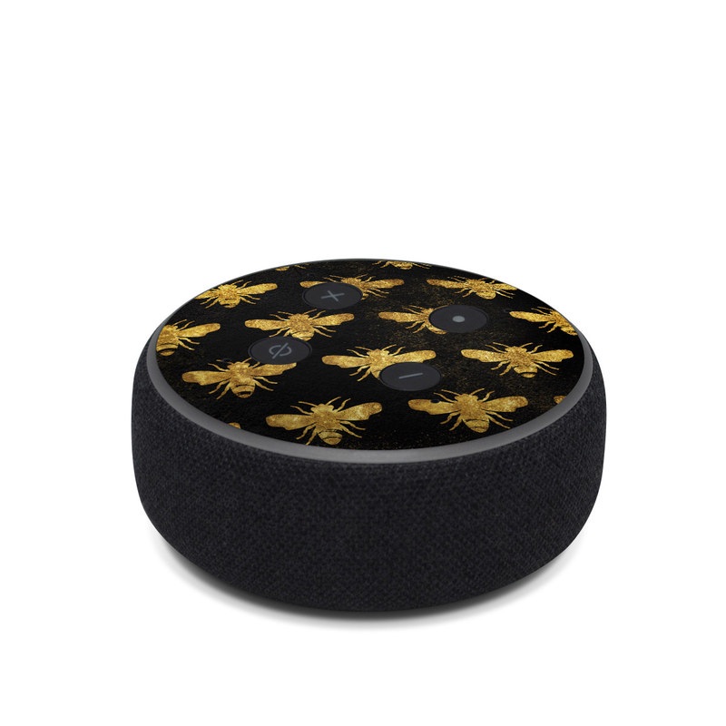 iStyles Amazon Echo Dot 3rd Gen Skin design of Pattern, Yellow, Flower, Design, Plant, Wildflower, Textile, Metal, with black, yellow colors, and tagged with patterns, animals, bee, bees, bugs, fashion, gold, insect.