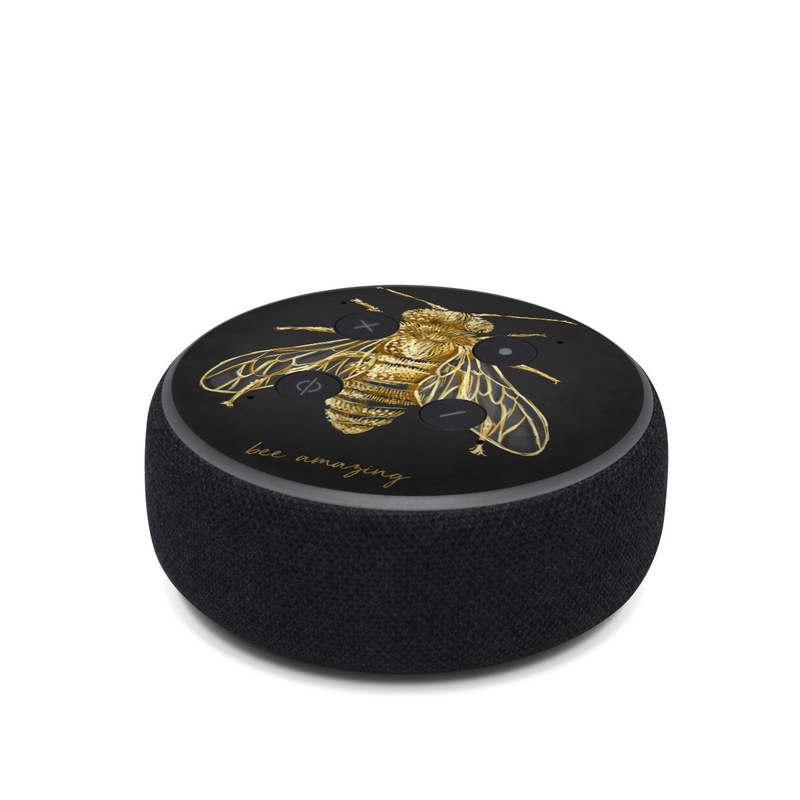 iStyles Amazon Echo Dot 3rd Gen Skin design of Insect, Invertebrate, Membrane-winged insect, Arthropod, Pest, Net-winged insects, Bee, Cicada, Macro photography, Pollinator, with black, yellow, white colors, and tagged with animals, signs, bee, bees, bug, draw, drawing, glitter, gold, insect, sketch.