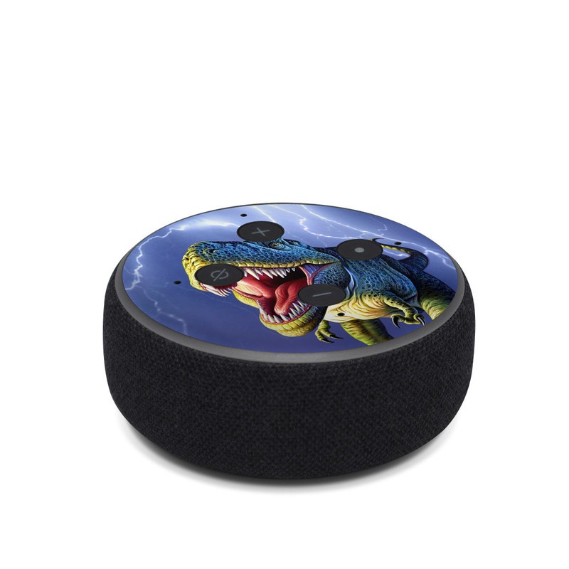 iStyles Amazon Echo Dot 3rd Gen Skin design of Dinosaur, Extinction, Tyrannosaurus, Velociraptor, Tooth, Jaw, Organism, Mouth, Fictional character, Art, with blue, green, yellow, orange, red colors, and tagged with fantasy, animals.