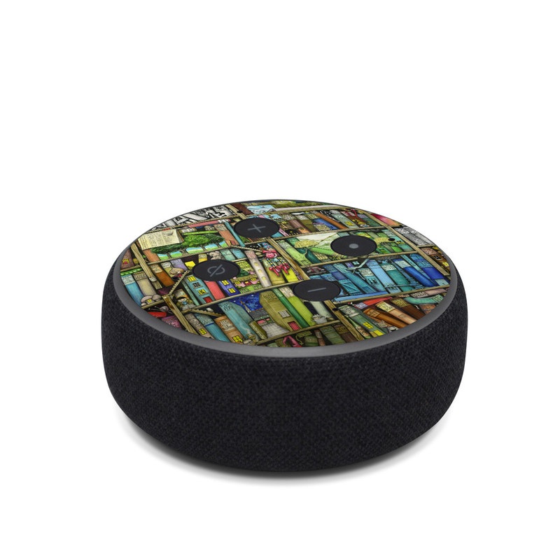 iStyles Amazon Echo Dot 3rd Gen Skin design of Collection, Art, Visual arts, Bookselling, Shelving, Painting, Building, Shelf, Publication, Modern art, with brown, green, blue, red, pink colors, and tagged with patterns, objects, animals.