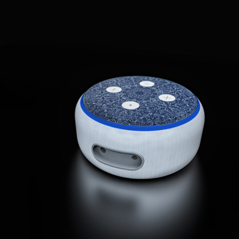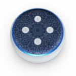 iStyles Amazon Echo Dot 3rd Gen Skin design of Blue, Pattern, Azure, Cobalt blue, Design, Textile, Electric blue, Wallpaper, Symmetry, with blue, white colors, and tagged with patterns, space, blue, bohemian, boho, pattern, white.