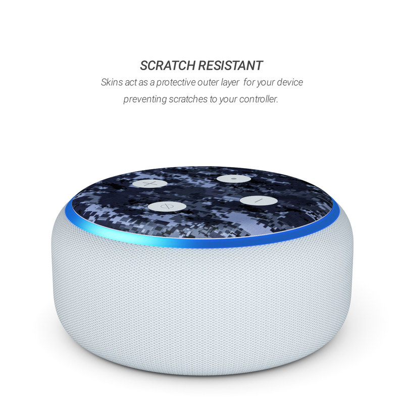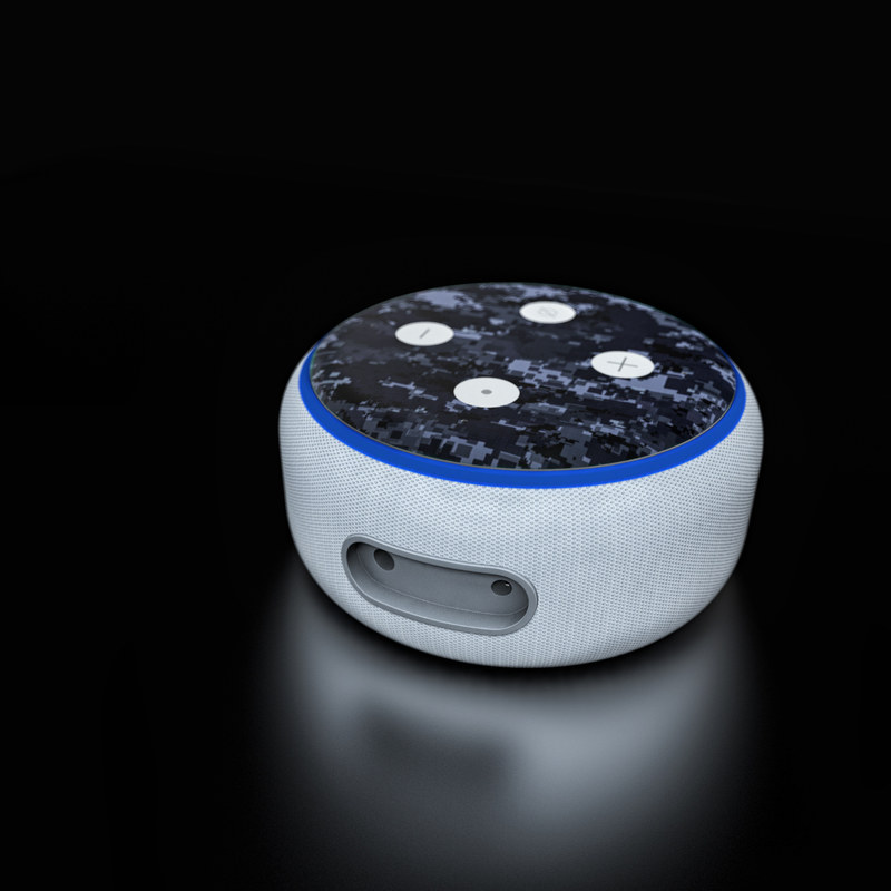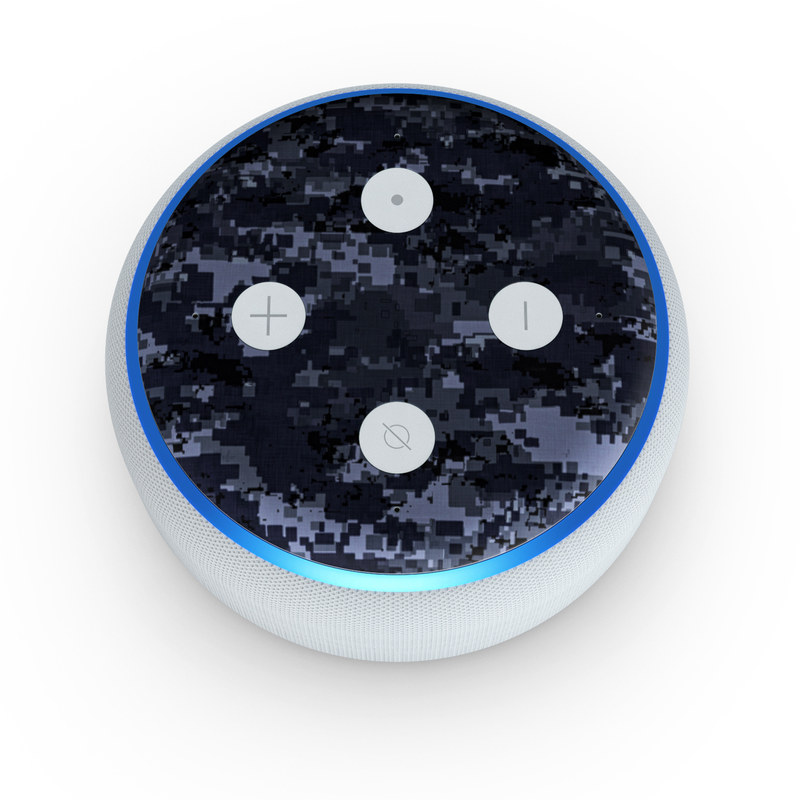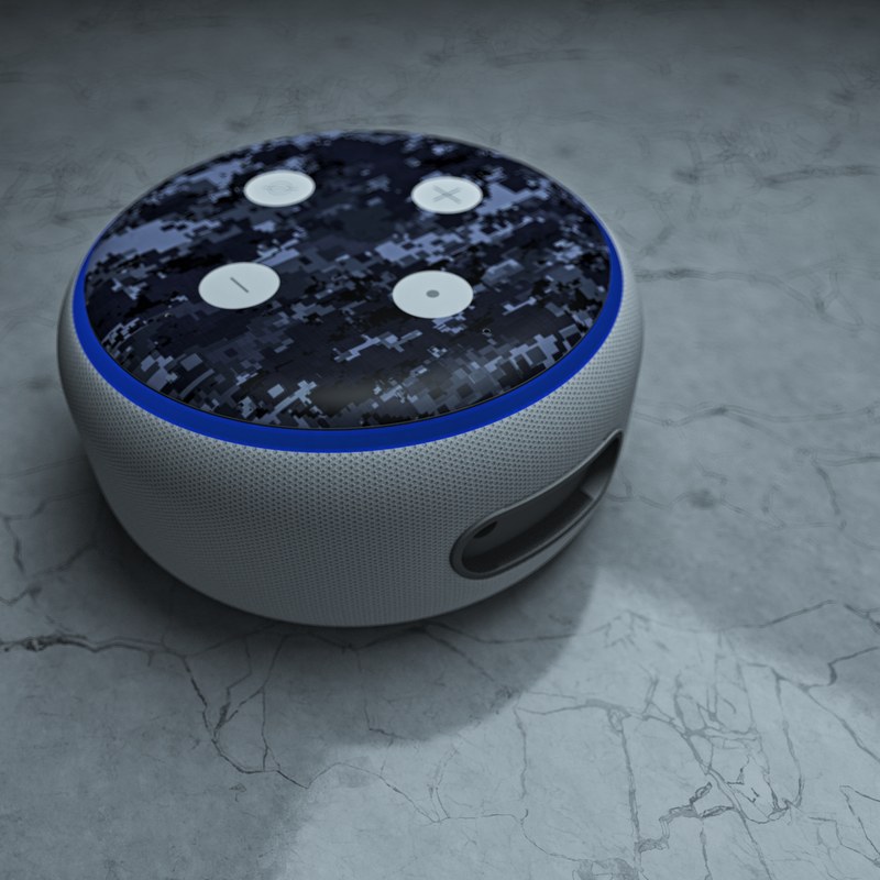 iStyles Amazon Echo Dot 3rd Gen Skin design of Military camouflage, Black, Pattern, Blue, Camouflage, Design, Uniform, Textile, Black-and-white, Space, with black, gray, blue colors, and tagged with military, lookslike, patterns.
