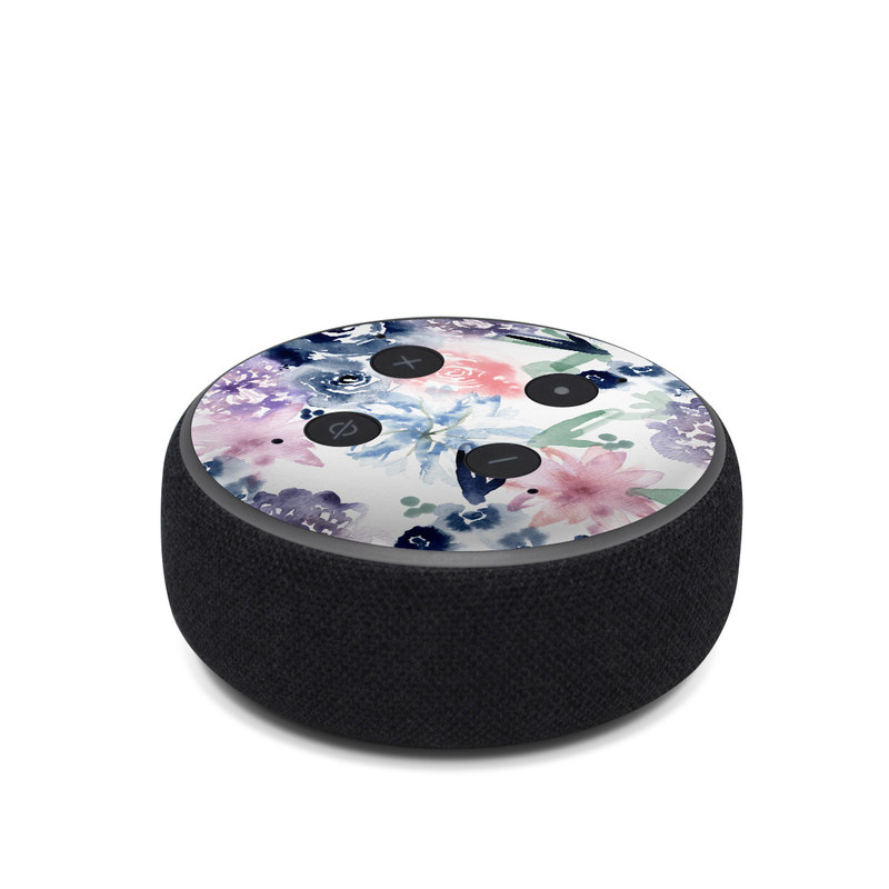 iStyles Amazon Echo Dot 3rd Gen Skin design of Pattern, Graphic design, Design, Floral design, Plant, Flower, Illustration, with white, blue, purple, green, pink colors, and tagged with flowers, patterns, florals, flowers, pattern, pink, violet, watercolor.