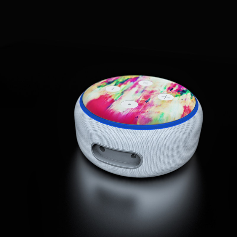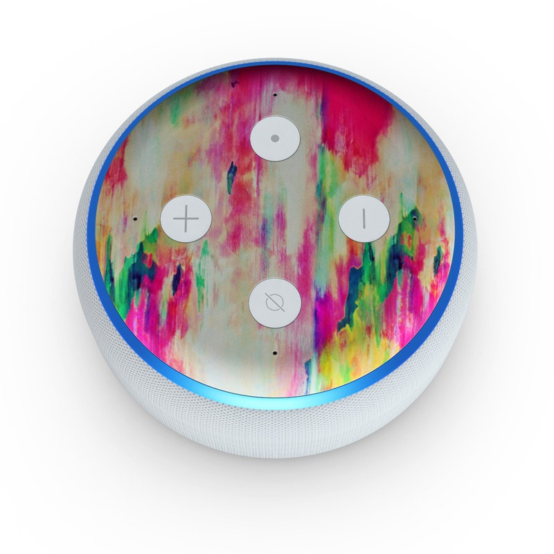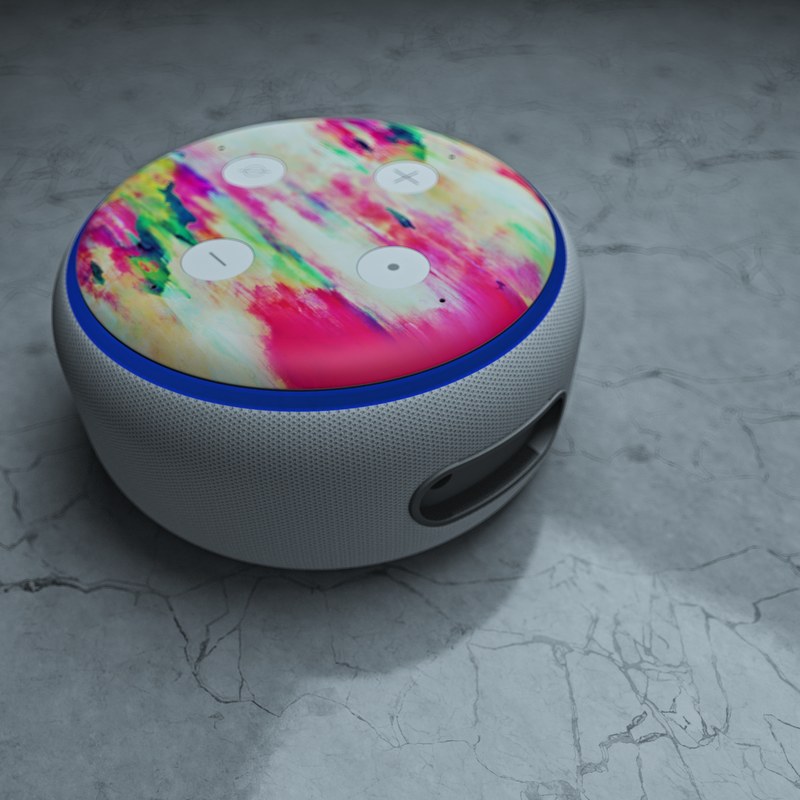 iStyles Amazon Echo Dot 3rd Gen Skin design of Pink, Magenta, Art, Watercolor paint, Dye, Visual arts, Pattern, Modern art, Painting, Acrylic paint, with red, white, green colors, and tagged with abstract, patterns.