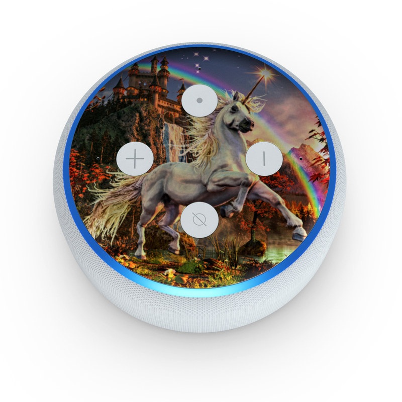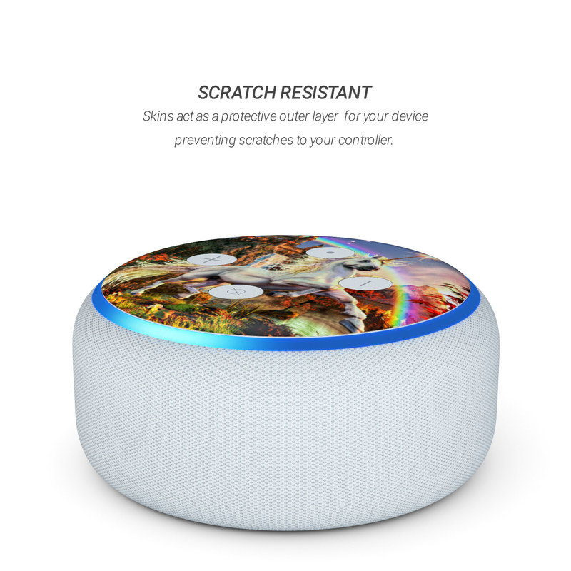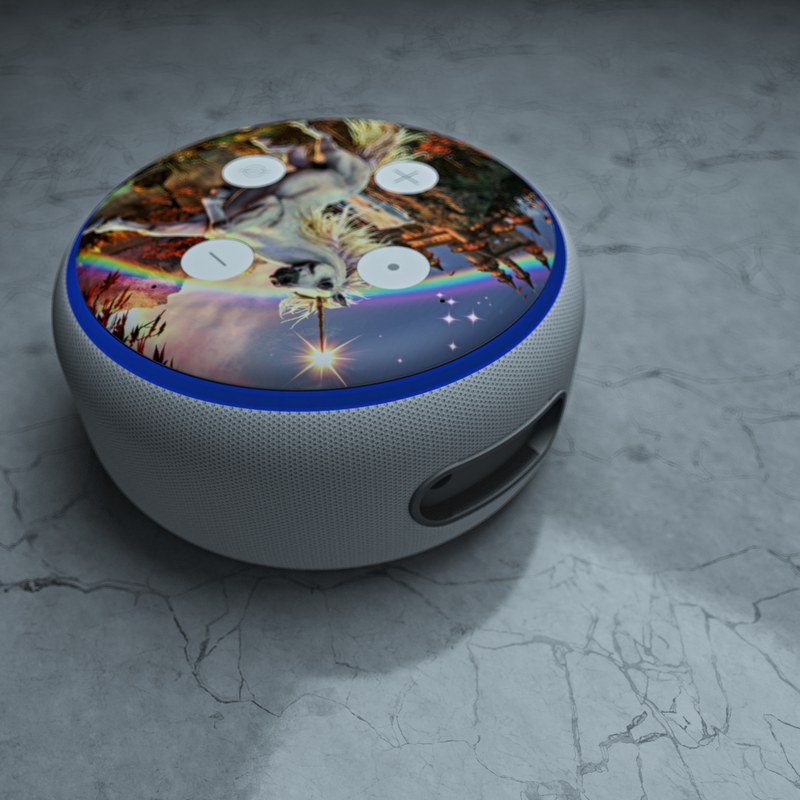 iStyles Amazon Echo Dot 3rd Gen Skin design of Nature, Unicorn, Fictional character, Sky, Mythical creature, Mythology, Cg artwork, Horse, Mane, Wildlife, with black, gray, red, green, blue colors, and tagged with animals, fantasy, nature, urban.