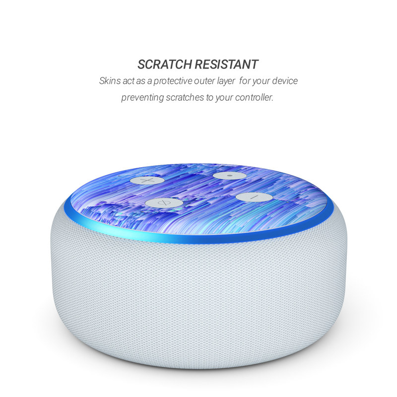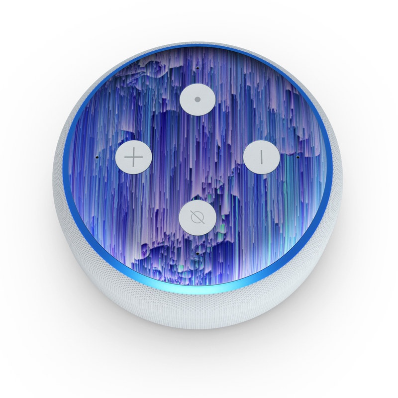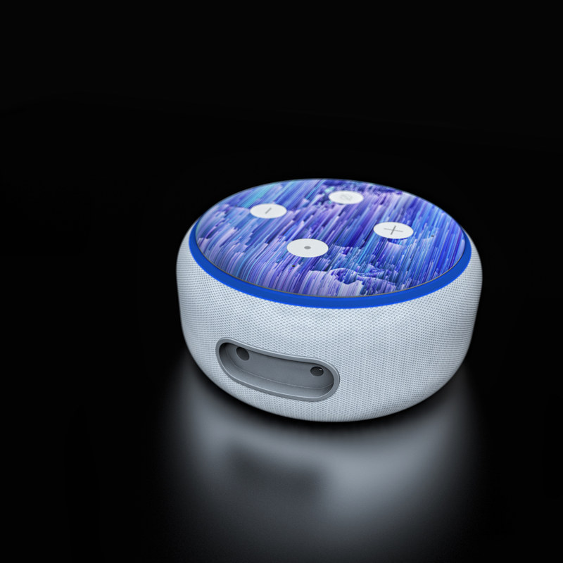 iStyles Amazon Echo Dot 3rd Gen Skin design of Blue, Purple, Lavender, Ice, with blue, purple colors, and tagged with abstract, space, blue, geometric, geometry, glitch, green, line, pastel, purple, space, teal.