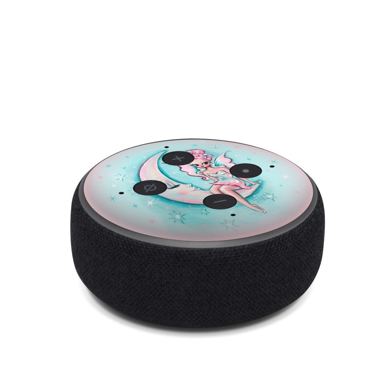 iStyles Amazon Echo Dot 3rd Gen Skin design of Fictional character, Angel, Cartoon, Pink, Illustration, Mythical creature, Art, with blue, pink, white colors, and tagged with people, fantasy, space, flowers, blue, fairy, fantasy, moon, pink, pixie.