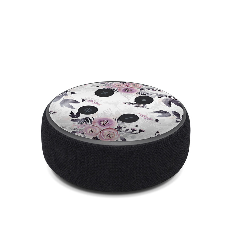 iStyles Amazon Echo Dot 3rd Gen Skin design of Pink, Pattern, Design, Floral design, Textile, Plant, Flower, Magenta, Petal, Wallpaper, with white, purple, pink, black, gray colors, and tagged with patterns, flowers, florals, flowers, pattern, purple, watercolor, white.