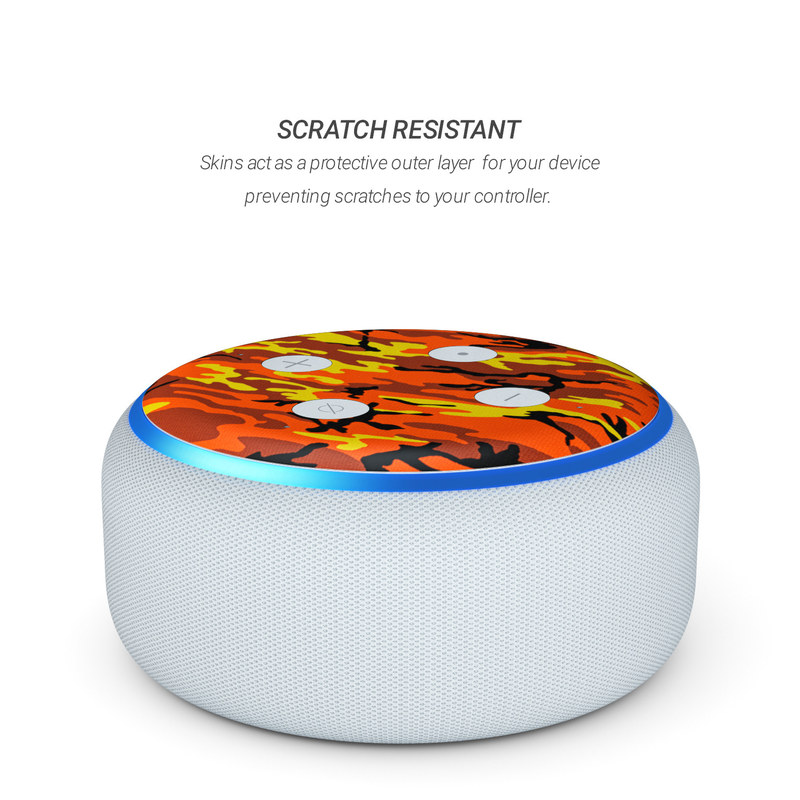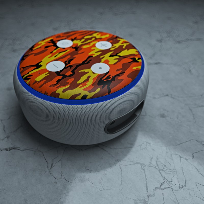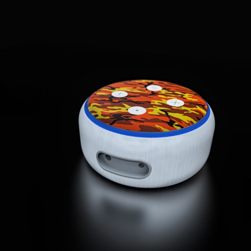 iStyles Amazon Echo Dot 3rd Gen Skin design of Military camouflage, Orange, Pattern, Camouflage, Yellow, Brown, Uniform, Design, Tree, Wildlife, with red, green, black colors, and tagged with military, lookslike, patterns.