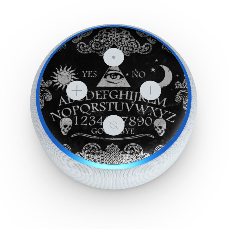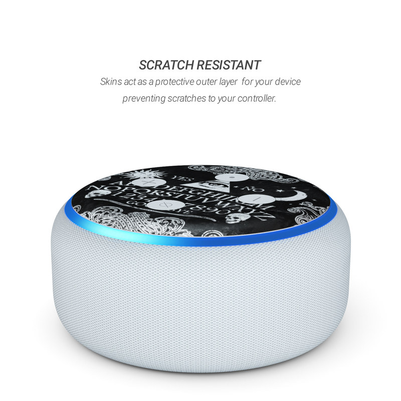 iStyles Amazon Echo Dot 3rd Gen Skin design of Text, Font, Pattern, Design, Illustration, Headpiece, Tiara, Black-and-white, Calligraphy, Hair accessory, with black, white, gray colors, and tagged with signs, skulls, black, demons, ghosts, magic, magick, paranormal, skull, spirit, talking.