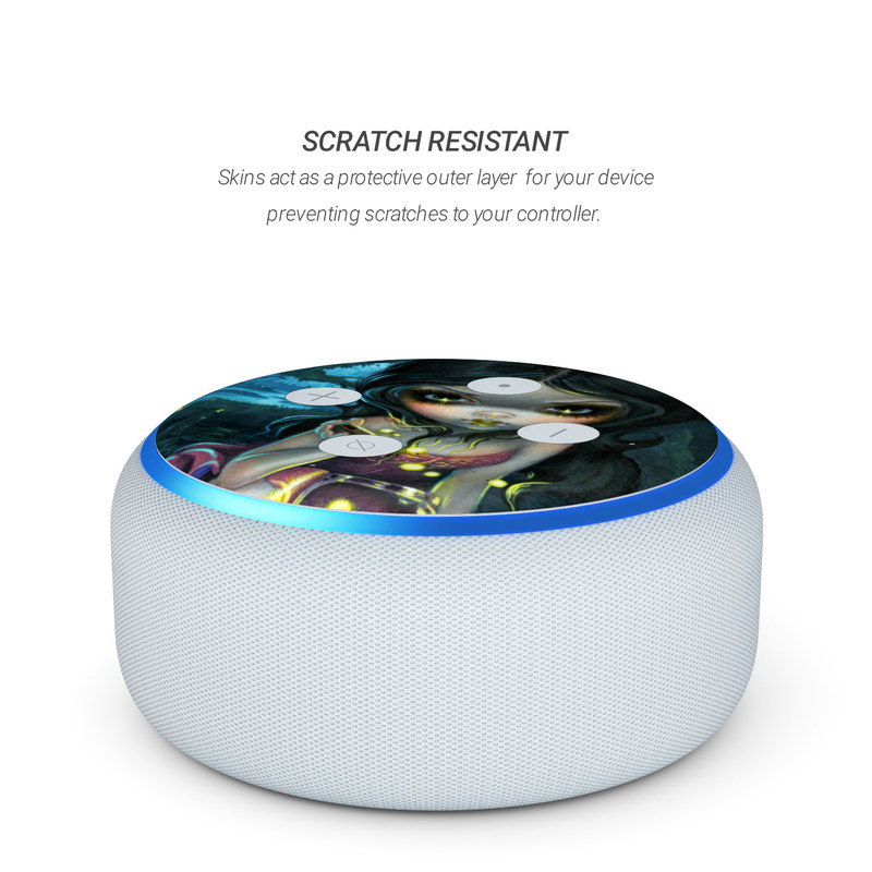iStyles Amazon Echo Dot 3rd Gen Skin design of Cg artwork, Illustration, Fictional character, Art, Iris, Black hair, Fawn, Mythology, Fiction, with blue, green, pink, yellow, black, white colors, and tagged with people, animals, nature, objects, fantasy, bugs, fantasy, fireflies, swamp.