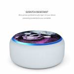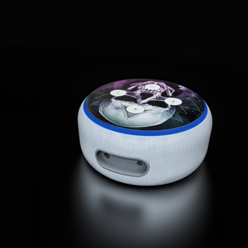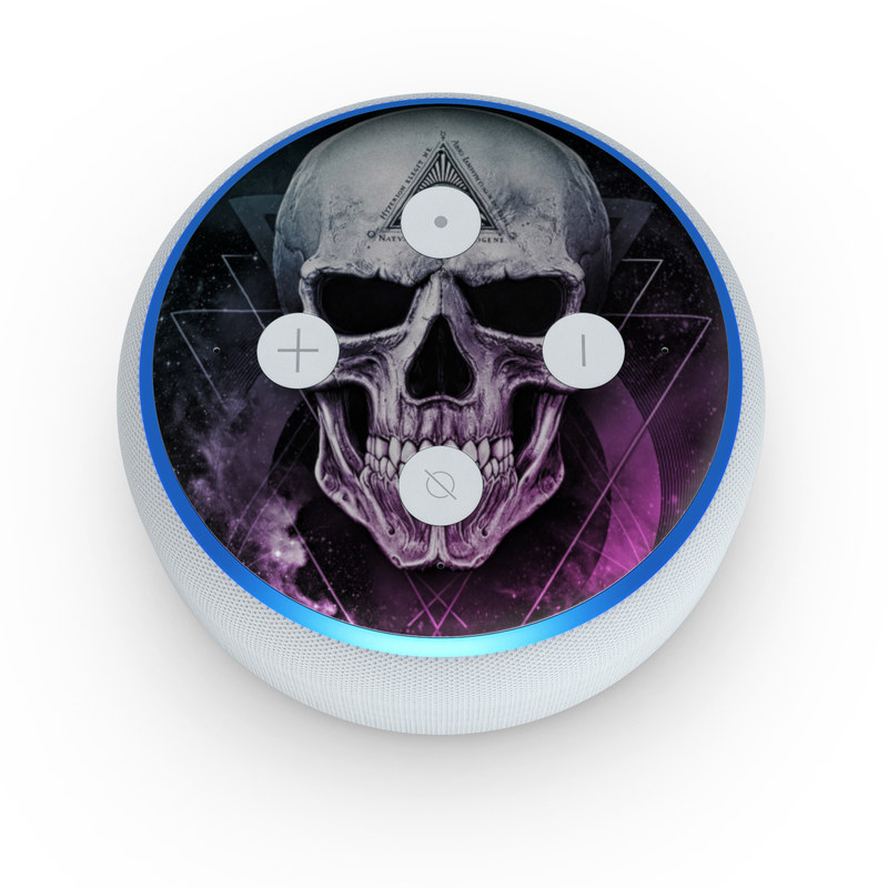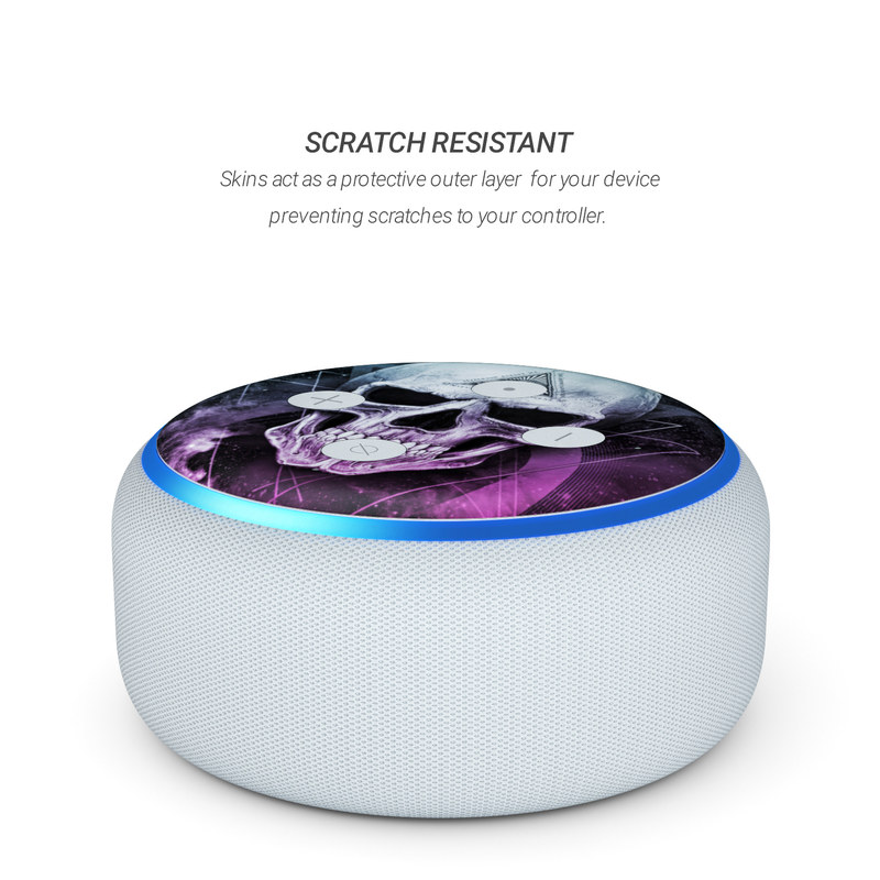 iStyles Amazon Echo Dot 3rd Gen Skin design of Skull, Bone, Illustration, Font, Jaw, Fictional character, Graphic design, Graphics, Art, with black, white, gray, purple colors, and tagged with signs, skulls, space, galaxy, geometric, goth, gothic, skull, space.