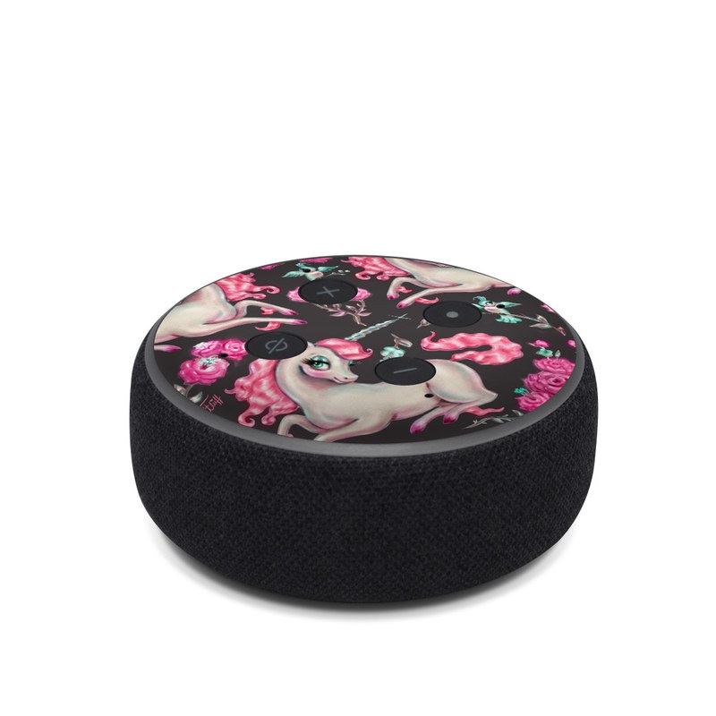 iStyles Amazon Echo Dot 3rd Gen Skin design of Pink, Horse, Pony, Fictional character, Unicorn, Mythical creature, Mane, Textile, Animal figure, Illustration, with white, pink, blue, black, red colors, and tagged with patterns, animals, flowers, fantasy, flower, flowers, magic, magical, pink, rose, roses, unicorn, unicorns.
