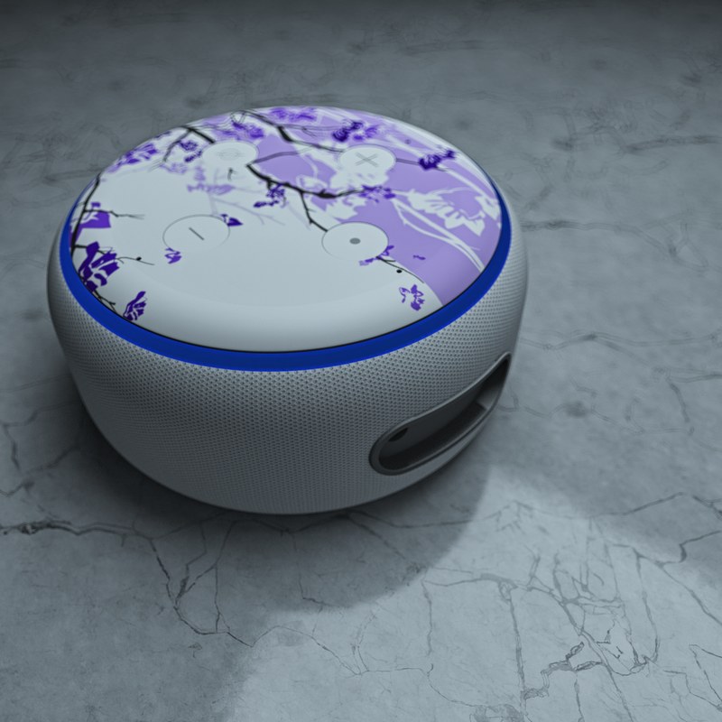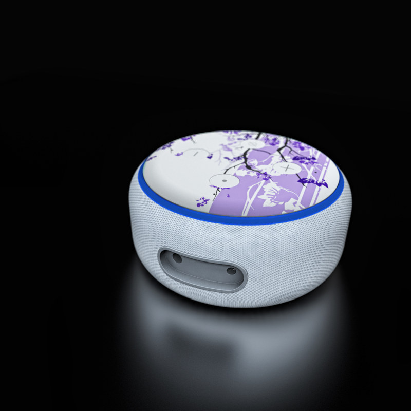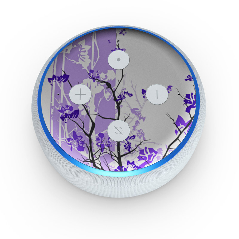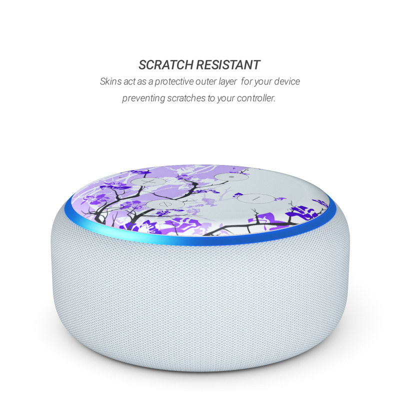 iStyles Amazon Echo Dot 3rd Gen Skin design of Branch, Purple, Violet, Lilac, Lavender, Plant, Twig, Flower, Tree, Wildflower, with white, purple, gray, pink, black colors, and tagged with flowers.
