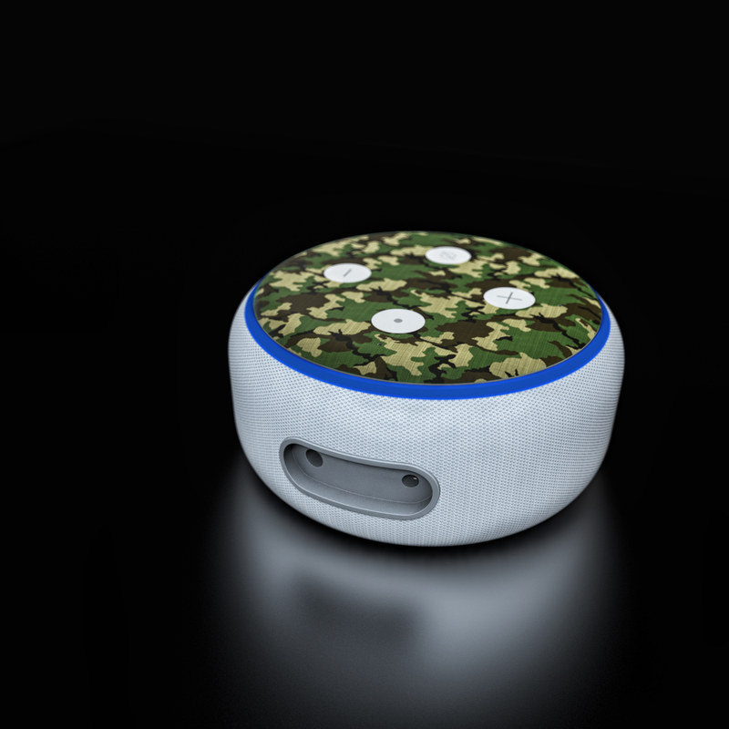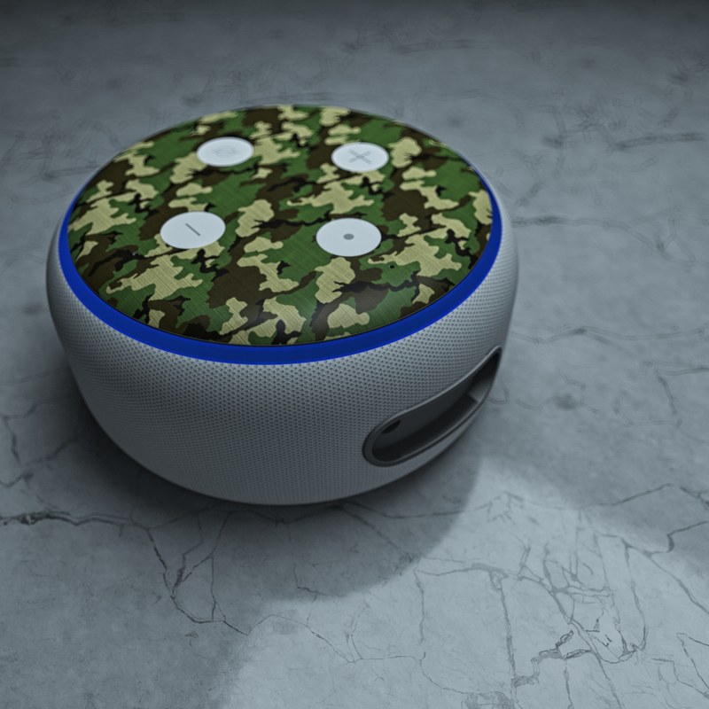iStyles Amazon Echo Dot 3rd Gen Skin design of Military camouflage, Camouflage, Clothing, Pattern, Green, Uniform, Military uniform, Design, Sportswear, Plane, with black, gray, green colors, and tagged with military, lookslike, patterns.