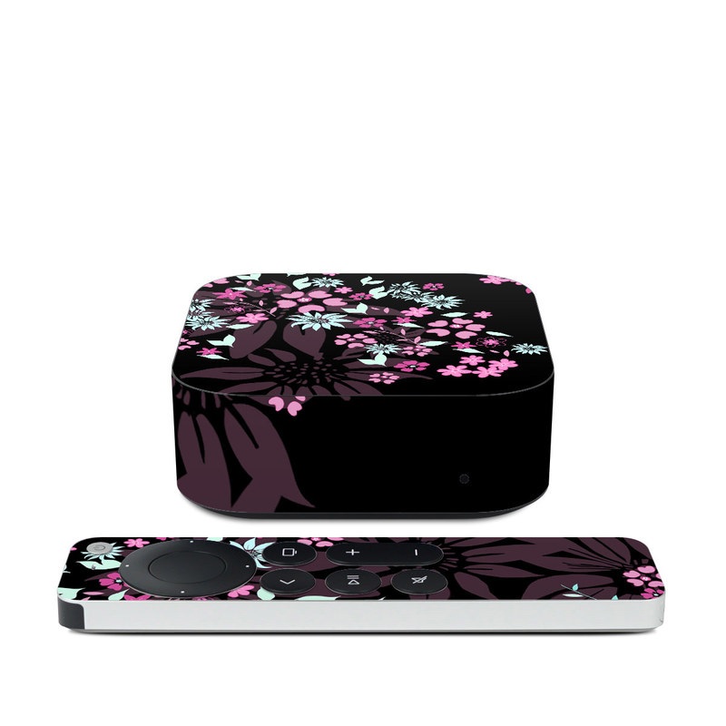 iStyles Apple TV 4K 2nd Gen Skin design of Pink, Pattern, Flower, Plant, Botany, Petal, Floral design, Design, Pedicel, Graphic design, with black, gray, purple, green, red, pink colors, and tagged with flowers, abstract, patterns.