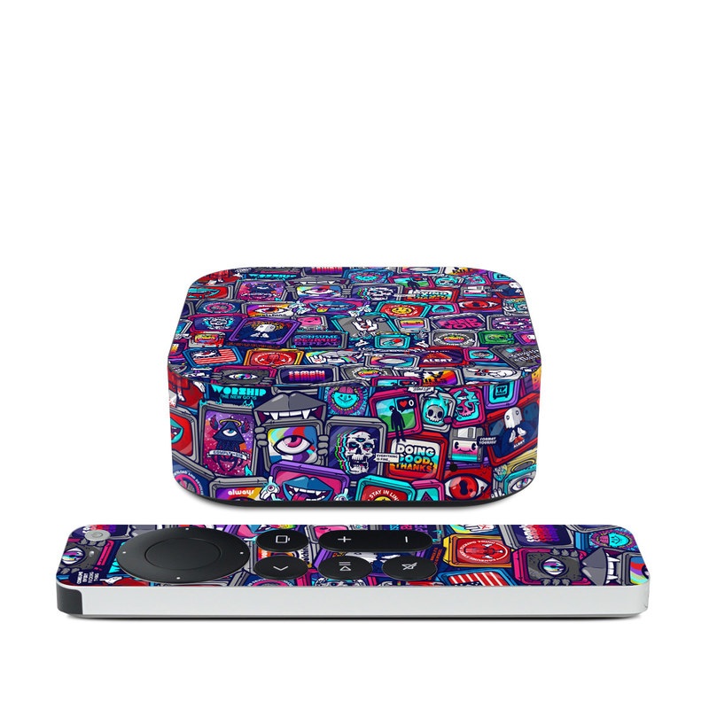 iStyles Apple TV 4K 2nd Gen Skin design of Pattern, Font, Art, Visual arts, Collection, with red, blue, black, gray, purple, yellow, white, green colors, and tagged with patterns, objects, signs, skulls, illustration, modern, skull, tattoo, thenewgods, tv, vector.