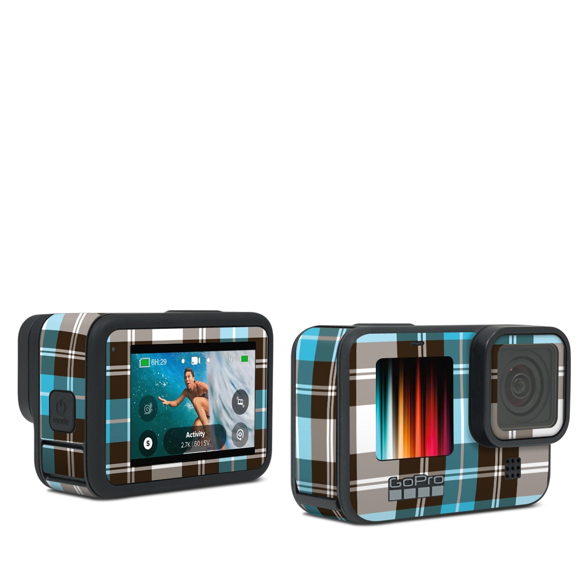 iStyles GoPro HERO Black Series Skin design of Plaid, Pattern, Tartan, Turquoise, Textile, Design, Brown, Line, Tints and shades, with gray, black, blue, white colors, and tagged with patterns.