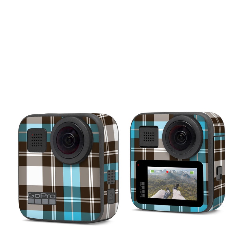 iStyles GoPro Max Skin design of Plaid, Pattern, Tartan, Turquoise, Textile, Design, Brown, Line, Tints and shades, with gray, black, blue, white colors, and tagged with patterns.