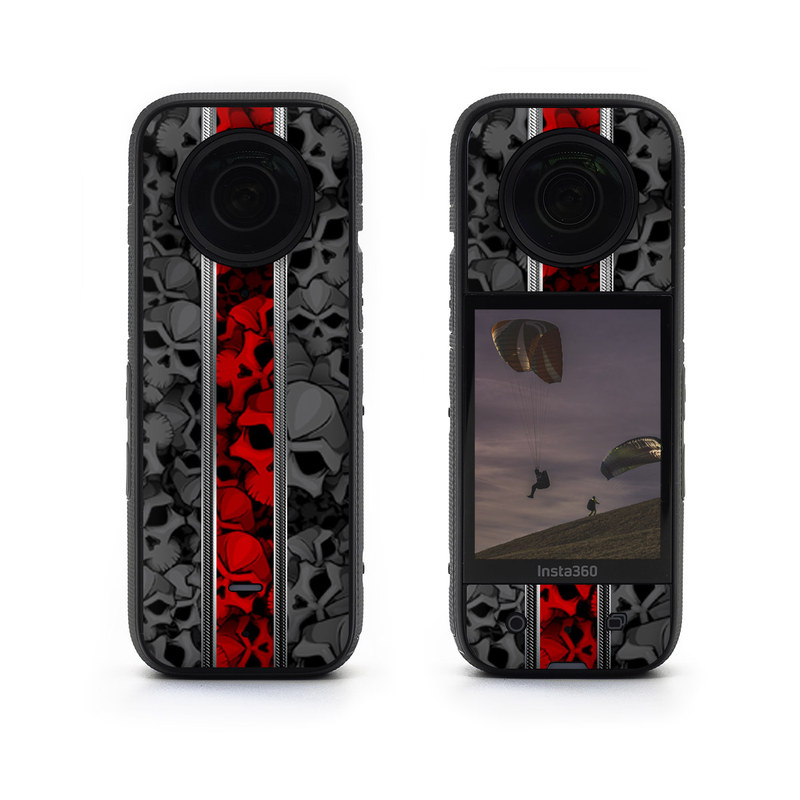 iStyles Insta360 X3 Skin design of Font, Text, Pattern, Design, Graphic design, Black-and-white, Monochrome, Graphics, Illustration, Art, with black, red, gray colors, and tagged with skulls, patterns.