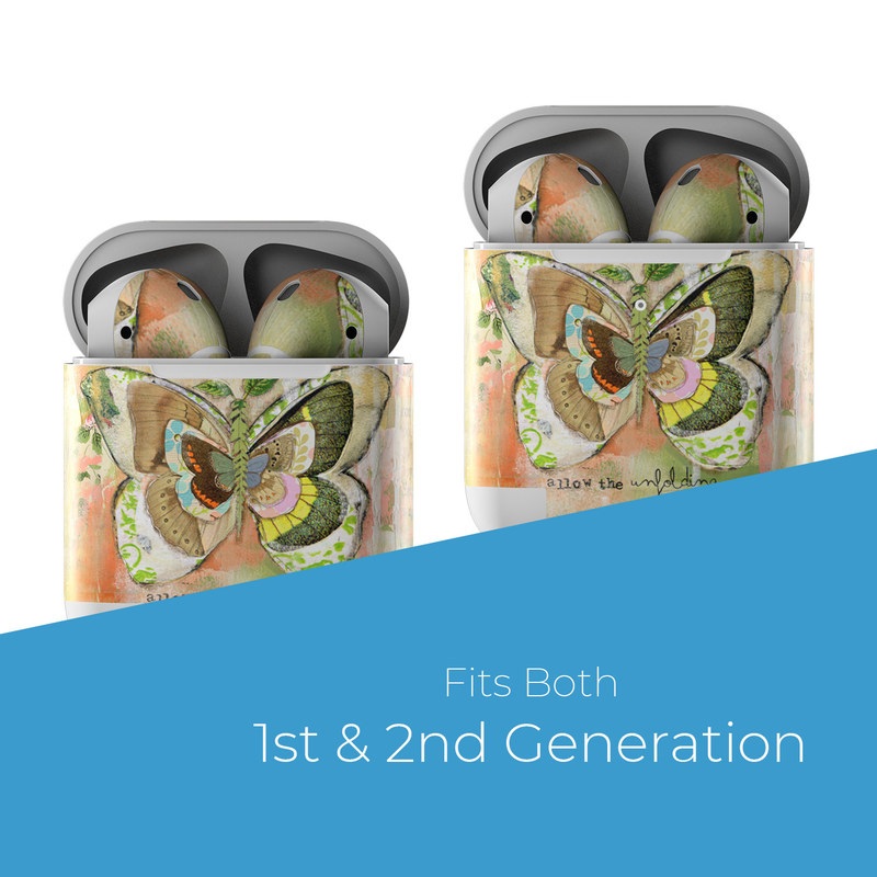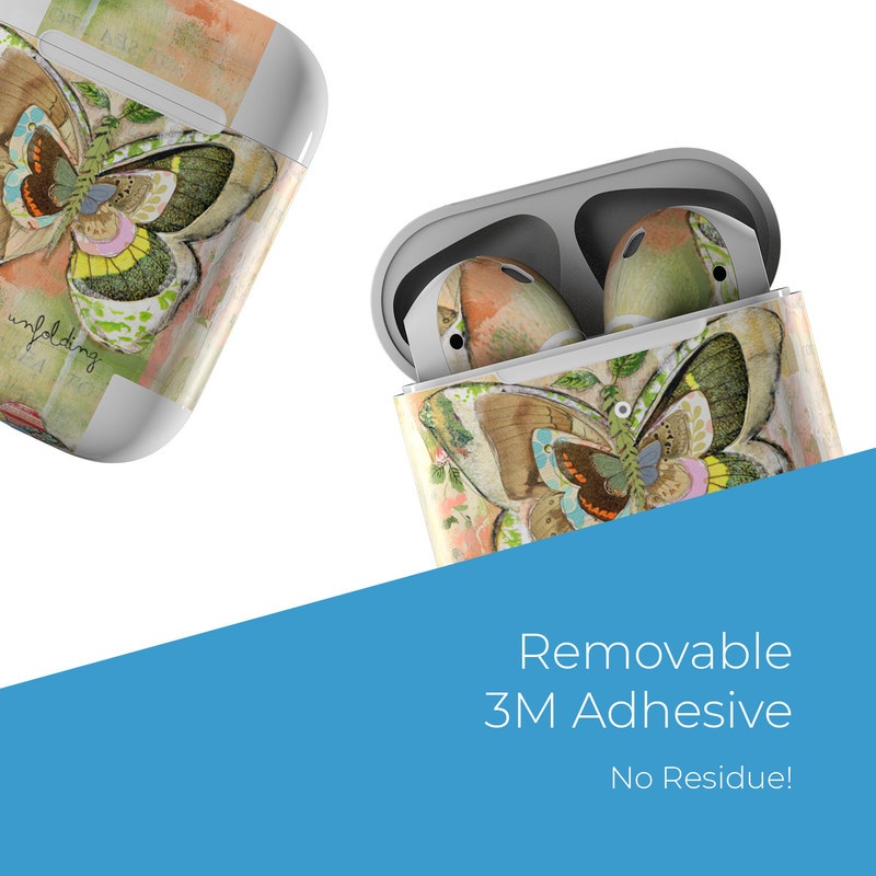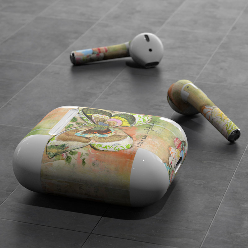 iStyles Apple AirPods Skin design of Butterfly, Art, Fictional character, Pollinator, Moths and butterflies, Watercolor paint, Illustration, with green, brown, yellow, blue, pink, red colors, and tagged with signs, flowers, animals.