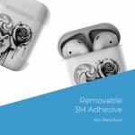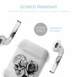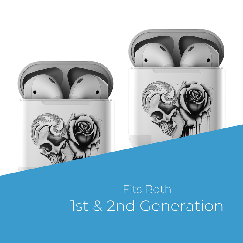 iStyles Apple AirPods Skin design of Black-and-white, Illustration, Monochrome, Rose, Plant, Style, Metal, Drawing, with white, black, gray colors, and tagged with hearts, flowers, skulls, goth, gothic, heart, ink, inkpen, rose, sketch, skull.