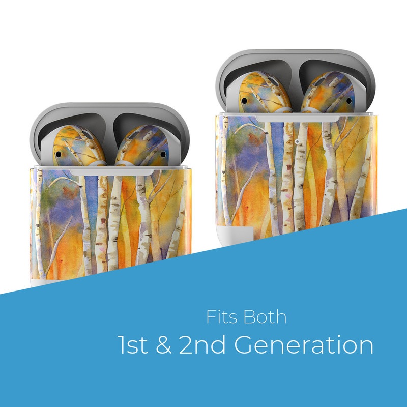 iStyles Apple AirPods Skin design of Canoe birch, Watercolor paint, Tree, Birch, Woody plant, Painting, Plant, Birch family, Paint, Trunk, with orange, yellow, green, white, purple, blue colors, and tagged with nature.