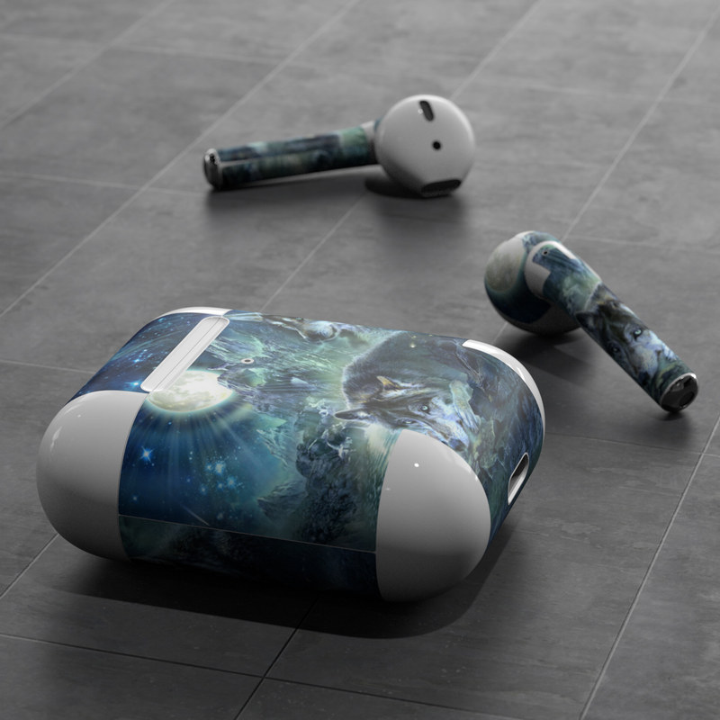 iStyles Apple AirPods Skin design of Cg artwork, Fictional character, Darkness, Werewolf, Illustration, Wolf, Mythical creature, Graphic design, Dragon, Mythology, with black, blue, gray, white colors, and tagged with animals, space.