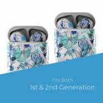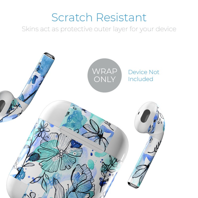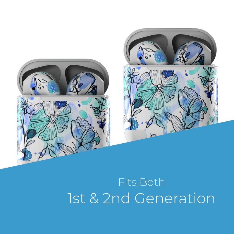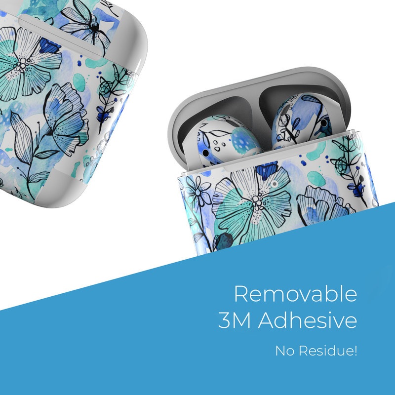 iStyles Apple AirPods Skin design of Blue, Pattern, Turquoise, Aqua, Design, Textile, Wildflower, Plant, Wrapping paper, Gift wrapping, with blue, white, black, purple colors, and tagged with patterns, flowers, blue, floral, flowers, ink, penandink, teal, watercolor.
