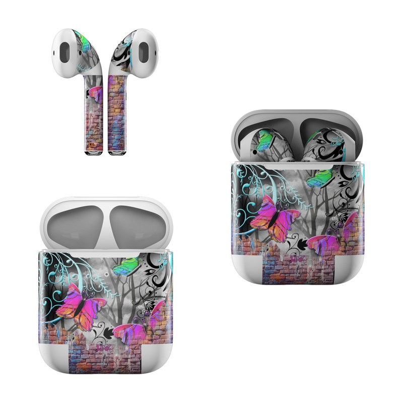 iStyles Apple AirPods Skin design of Purple, Graphic design, Art, Pattern, Graffiti, Organism, Street art, Wall, Font, Illustration, with red, black, gray, purple, orange, blue, green colors, and tagged with abstract, animals.