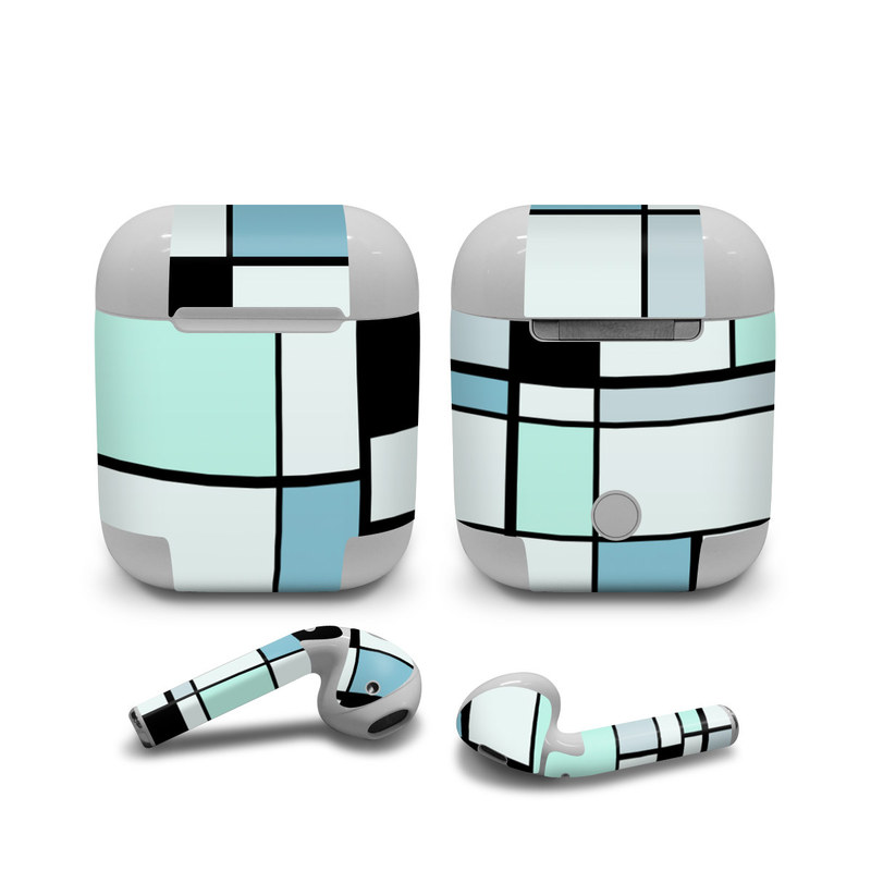 iStyles Apple AirPods Skin design of Blue, Line, Turquoise, Pattern, Rectangle, Design, Parallel, Square, Symmetry, Tints and shades, with black, blue, green colors, and tagged with patterns, blocks, blue, cool, geometry, lines.