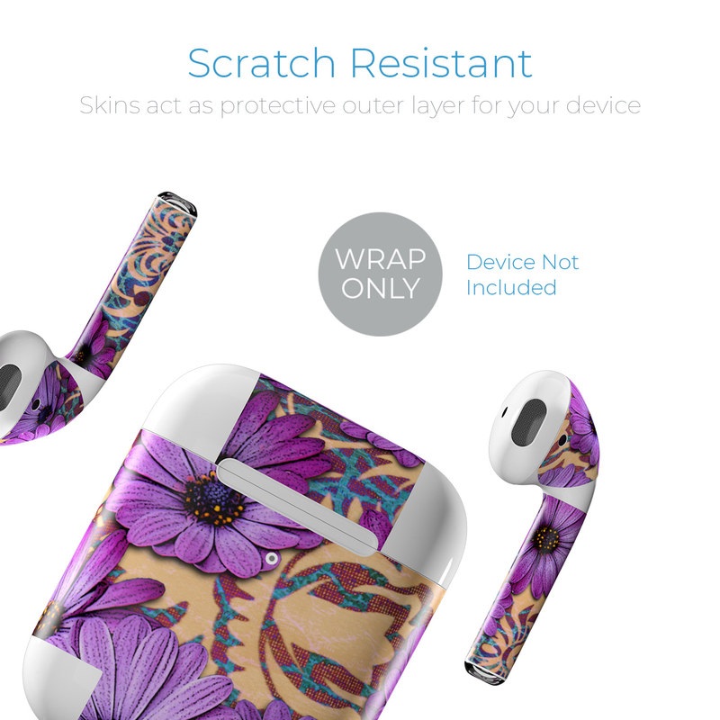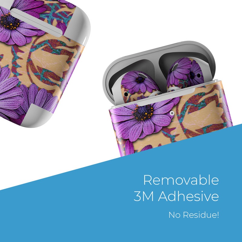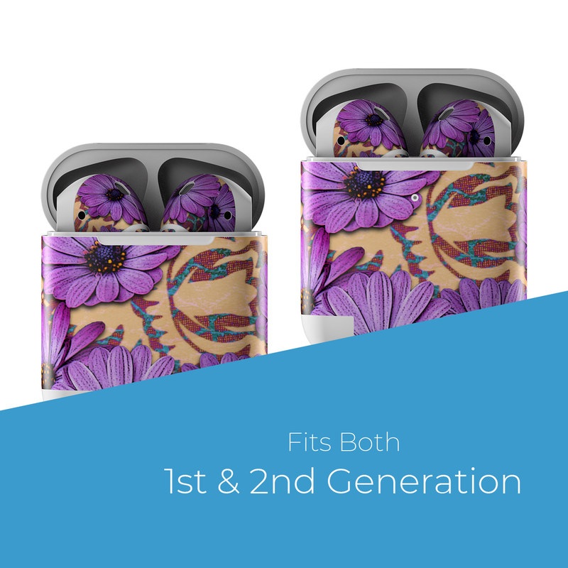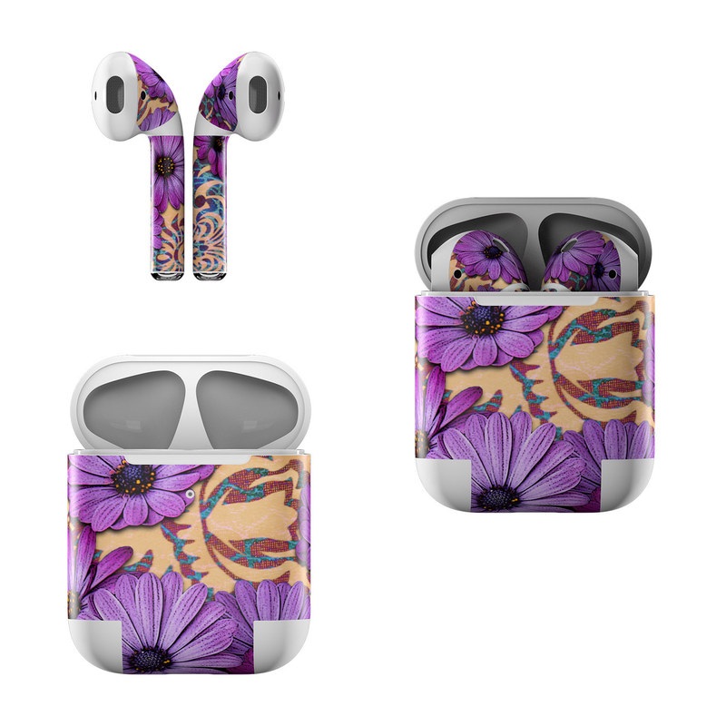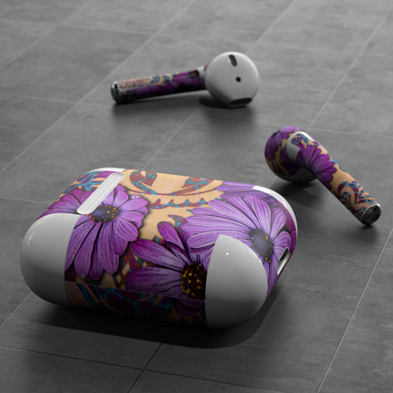iStyles Apple AirPods Skin design of Purple, Flower, Violet, Petal, Plant, african daisy, Floral design, Wildflower, Pattern, Textile, with purple, black, gray, blue, green, red colors, and tagged with flowers, patterns.