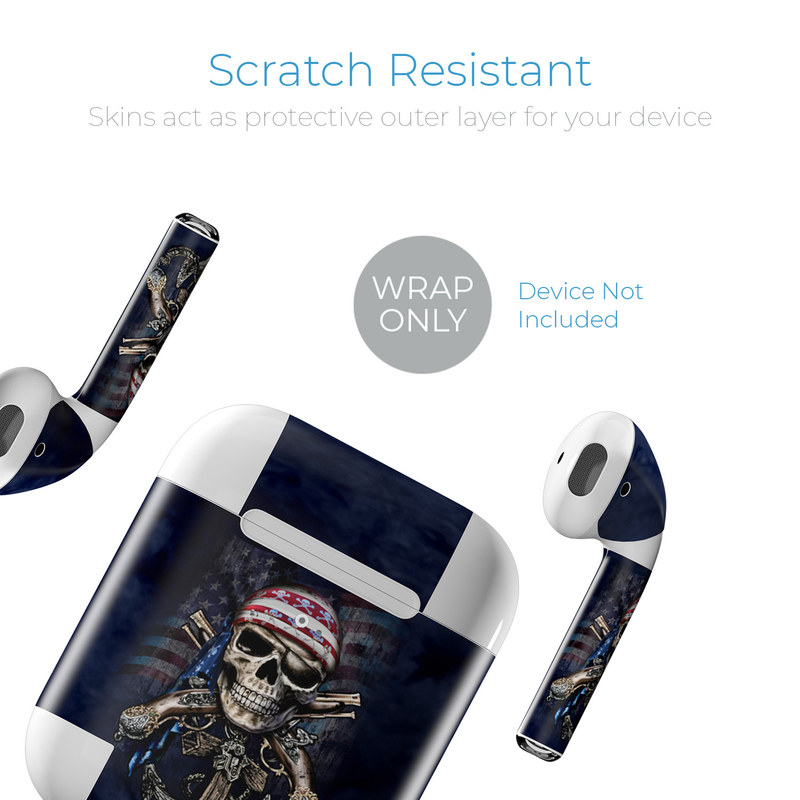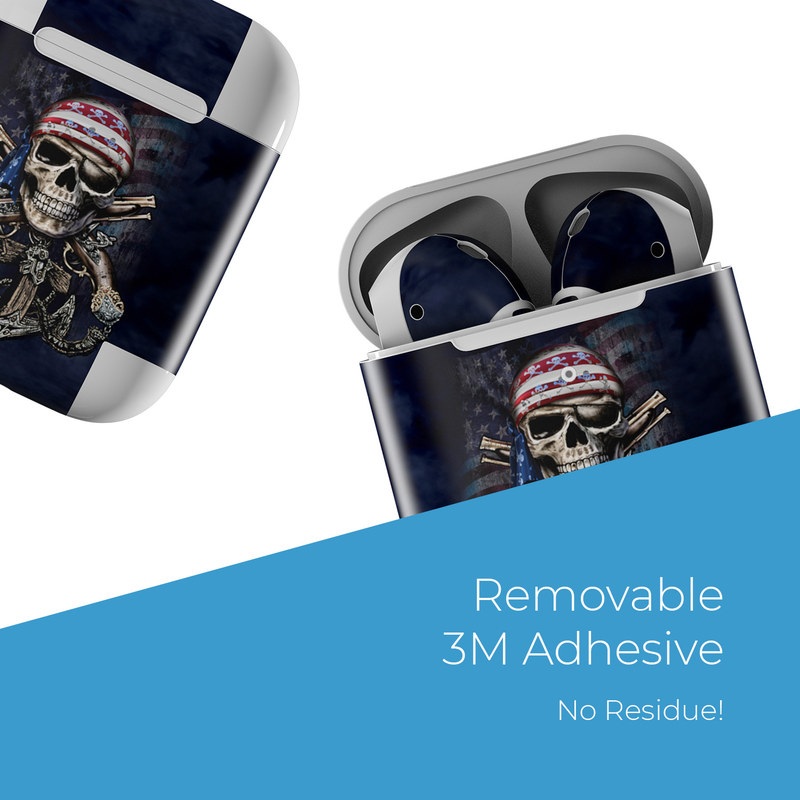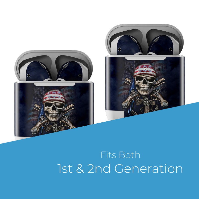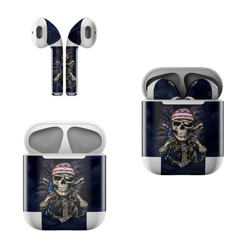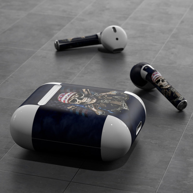 iStyles Apple AirPods Skin design of Skull, Bone, Skeleton, Illustration, Outerwear, T-shirt, Flag, Art, with black, gray, red colors, and tagged with skulls, flags, objects.