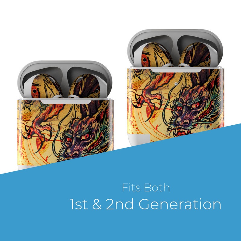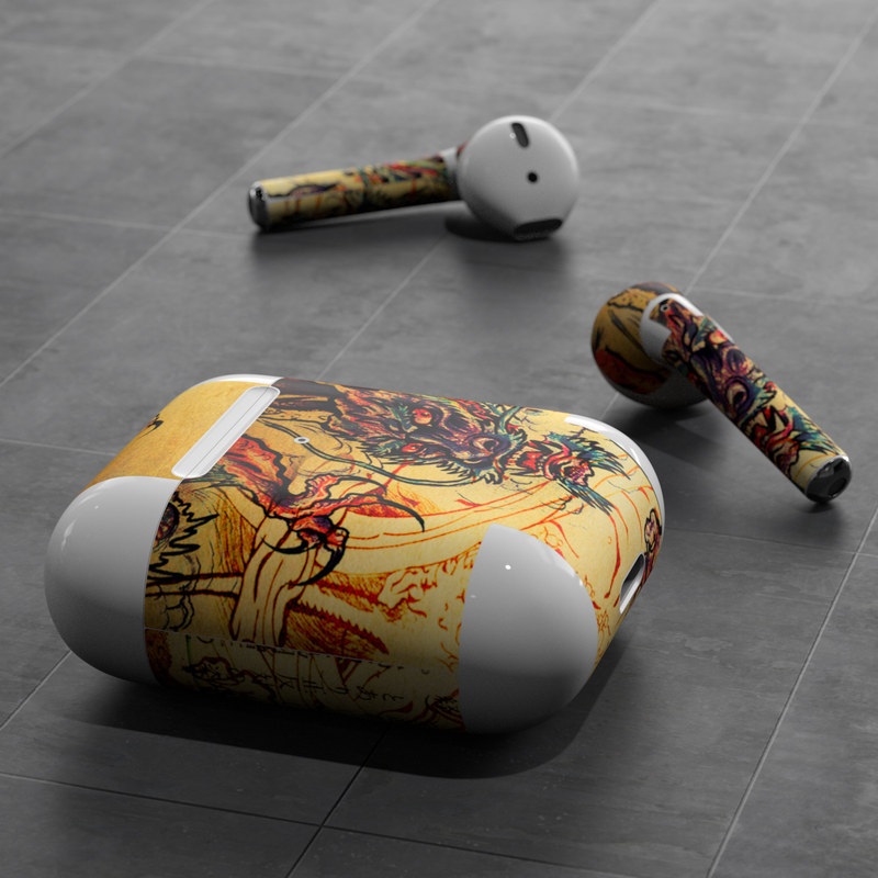 iStyles Apple AirPods Skin design of Illustration, Fictional character, Art, Demon, Drawing, Visual arts, Dragon, Supernatural creature, Mythical creature, Mythology, with black, green, red, gray, pink, orange colors, and tagged with fantasy.