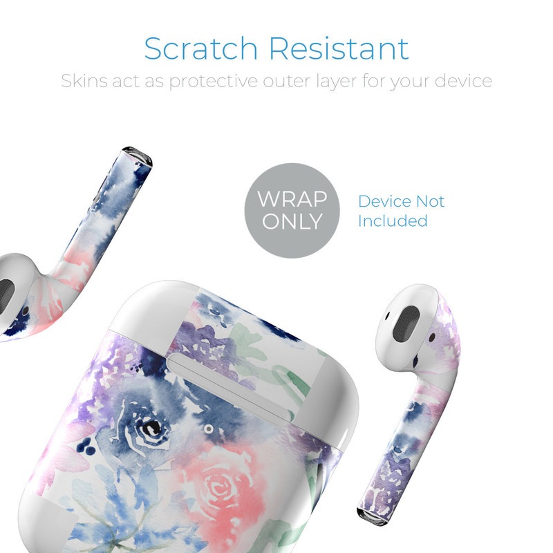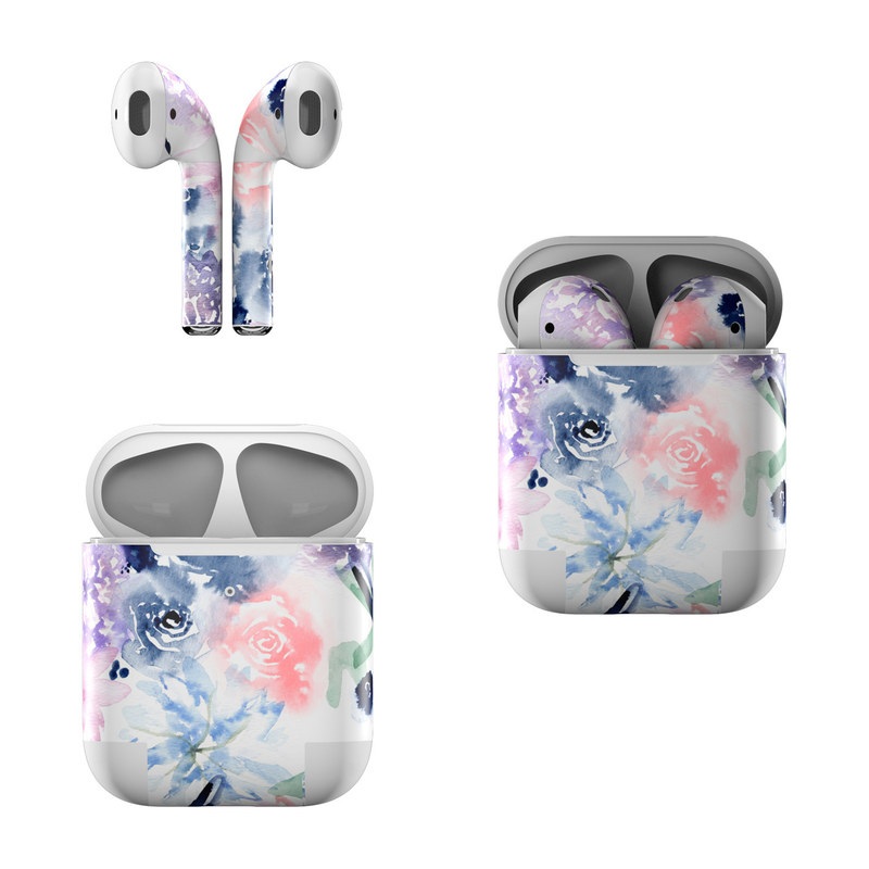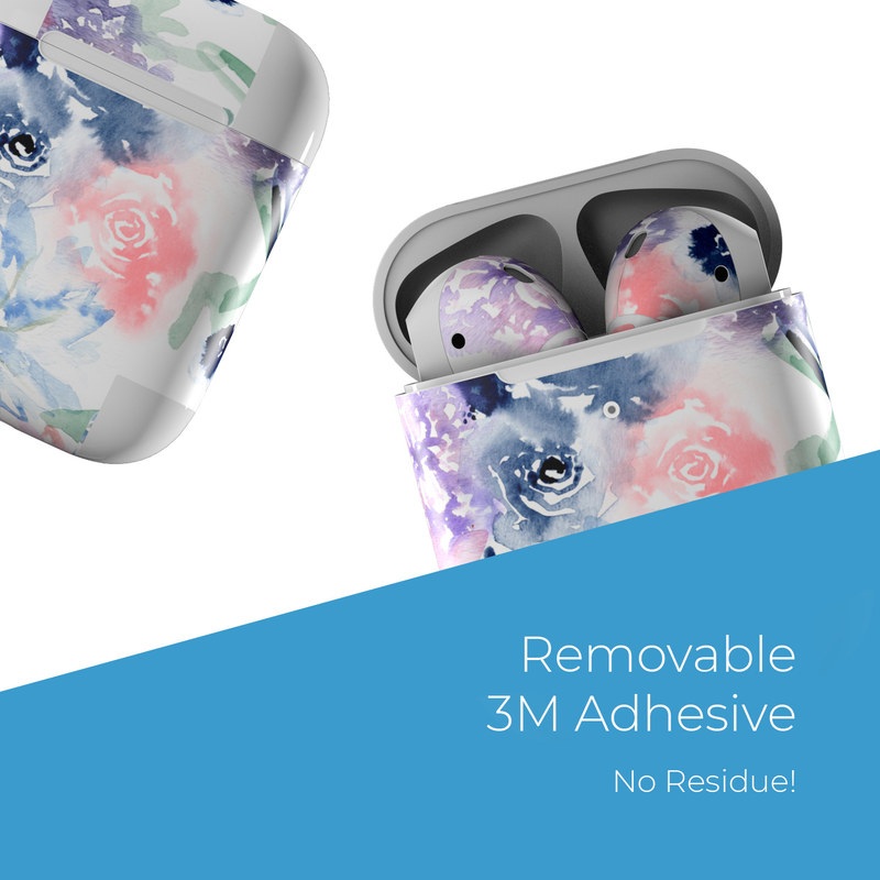 iStyles Apple AirPods Skin design of Pattern, Graphic design, Design, Floral design, Plant, Flower, Illustration, with white, blue, purple, green, pink colors, and tagged with flowers, patterns, florals, flowers, pattern, pink, violet, watercolor.