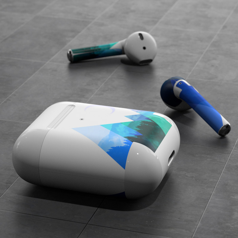 iStyles Apple AirPods Skin design of Blue, Cobalt blue, Azure, Pattern, Logo, Design, Electric blue, Graphics, Illustration, Triangle, with white, blue, purple, green colors, and tagged with nature, objects, signs, earth, geometry, moon, mountains, nature, plants, trees.