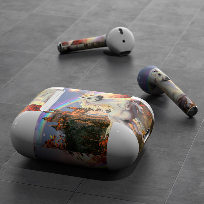 iStyles Apple AirPods Skin design of Nature, Unicorn, Fictional character, Sky, Mythical creature, Mythology, Cg artwork, Horse, Mane, Wildlife, with black, gray, red, green, blue colors, and tagged with animals, fantasy, nature, urban.