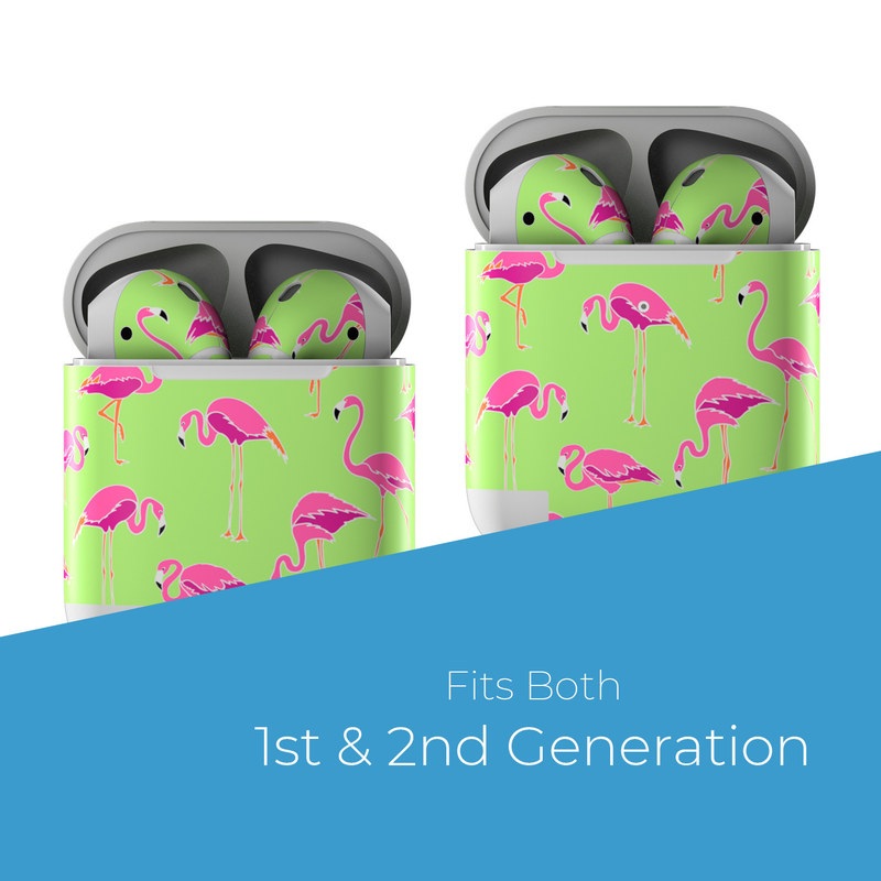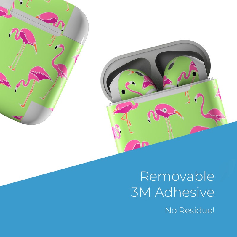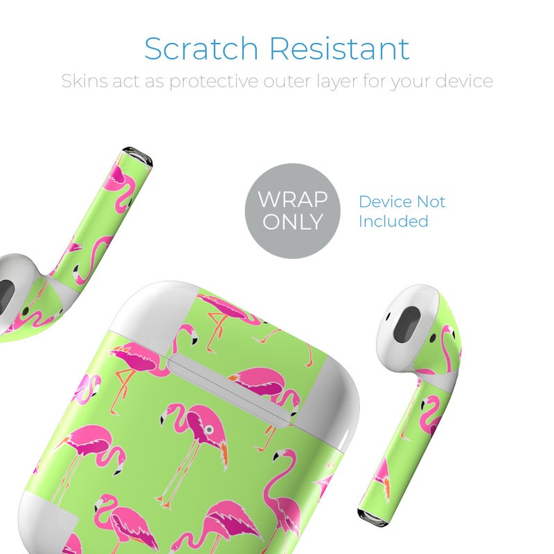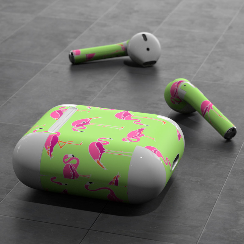 iStyles Apple AirPods Skin design of Pink, Green, Red, Pattern, Wrapping paper, Textile, Design, Flamingo, Line, with pink, green colors, and tagged with patterns, animals, animals, birds, flamingo, nature.