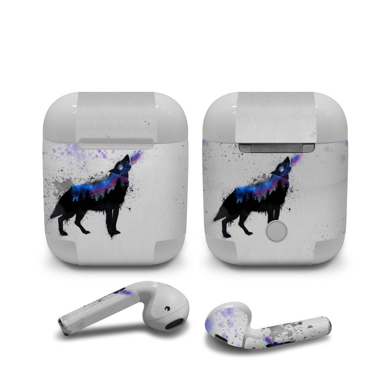 iStyles Apple AirPods Skin design of Canidae, Art, Illustration, Watercolor paint, Dog, Graphic design, Street art, Acrylic paint, Painting, Visual arts, with gray, white, blue, black, green, purple colors, and tagged with animals, nature, space, animals, coyote, dog, moon, nature, night, stars, watercolor, wolf.