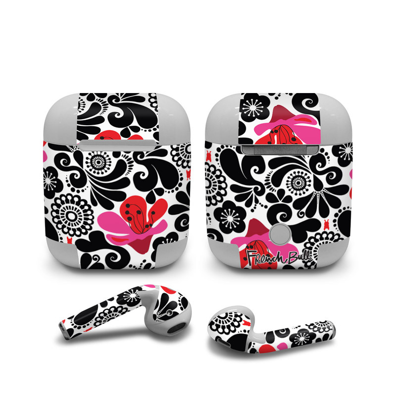 iStyles Apple AirPods Skin design of White, Product, Green, Botany, Petal, Textile, Pink, Creative arts, Line, Magenta, with black, white, pink, red colors, and tagged with patterns, flowers, black, blackandwhite, floral, flower, flowers, paisley, white.