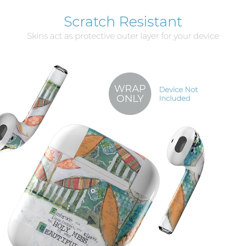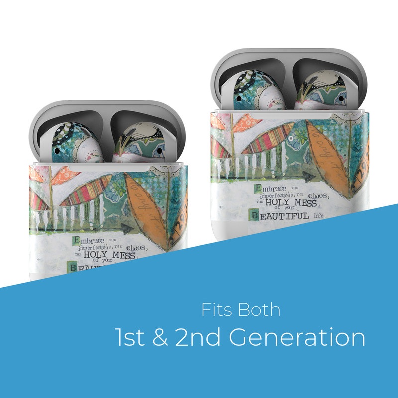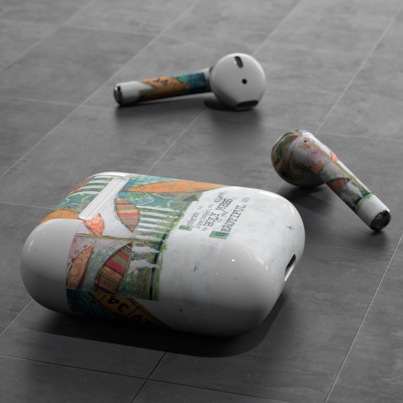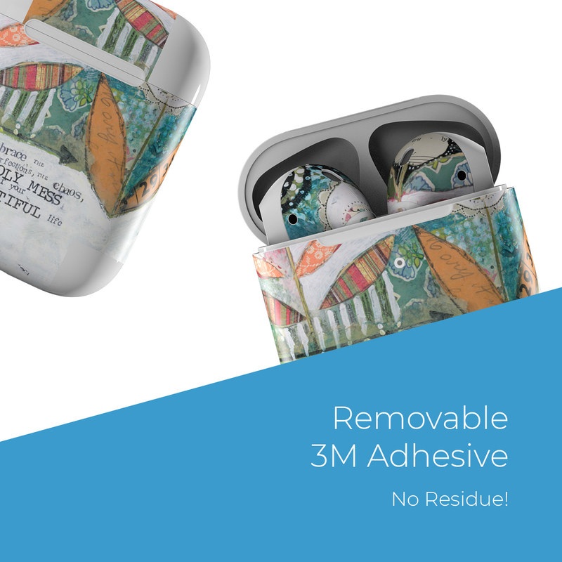 iStyles Apple AirPods Skin design of Leaf, Font, Plant, Illustration, Art, with blue, white, green, red, orange, yellow colors, and tagged with signs, flowers.