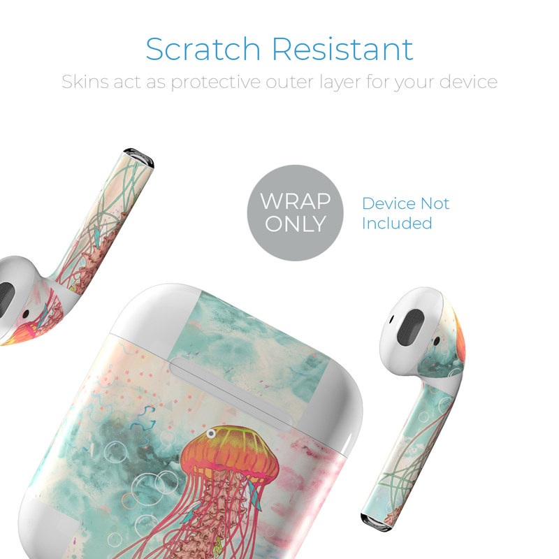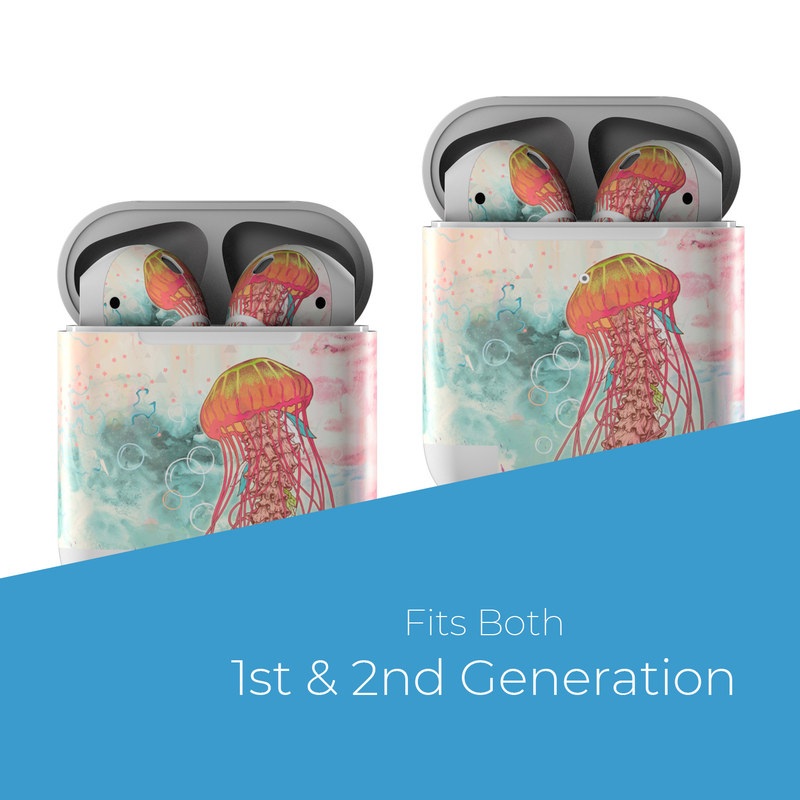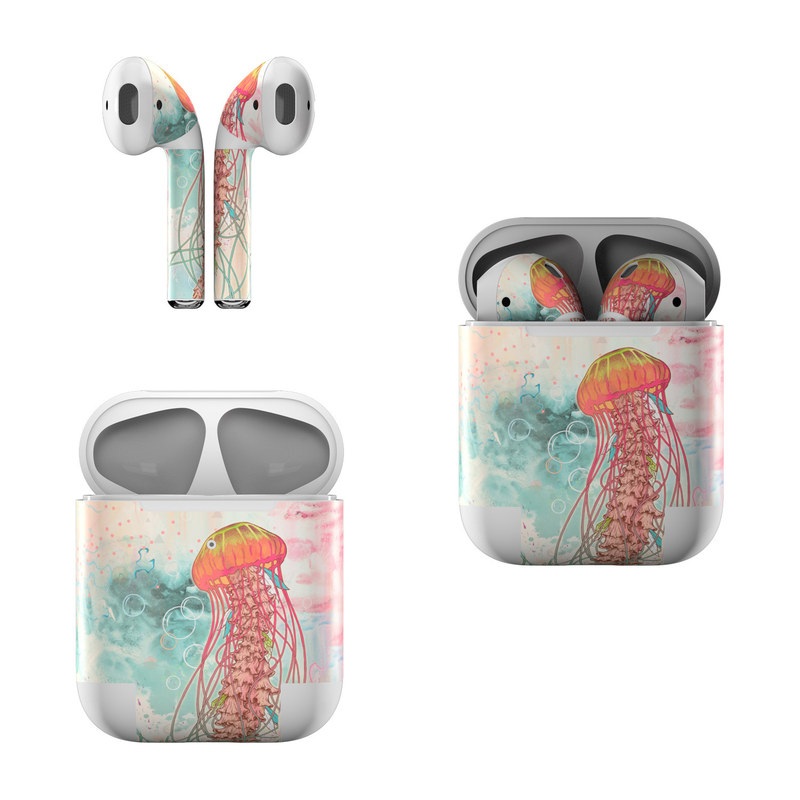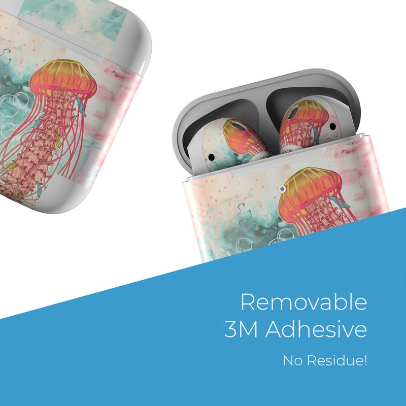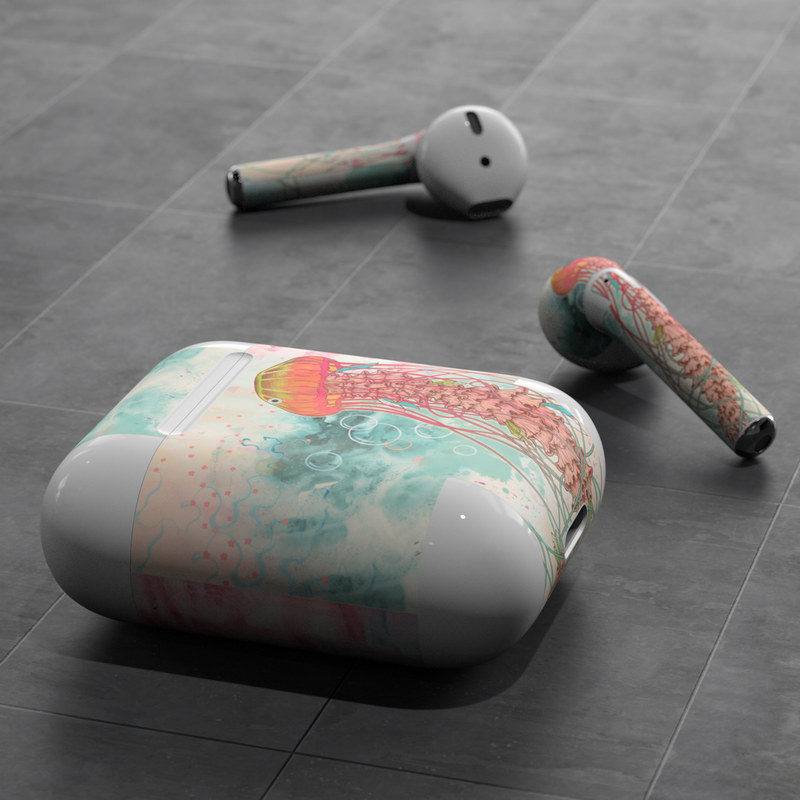iStyles Apple AirPods Skin design of Jellyfish, Illustration, Water, Cnidaria, Marine invertebrates, Organism, Portuguese man o' war, Art, Nepenthes, Invertebrate, with gray, pink, yellow, red, green colors, and tagged with animals, abstract, animals, aquatic, bubbles, jellyfish, ocean, sea, sketch.