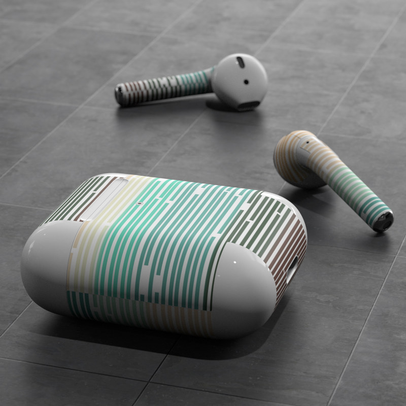 iStyles Apple AirPods Skin design of Line, Parallel, Pattern, with blue, brown, yellow, orange colors, and tagged with patterns, beach, lines, ocean, sand, stripes, summer, surf.