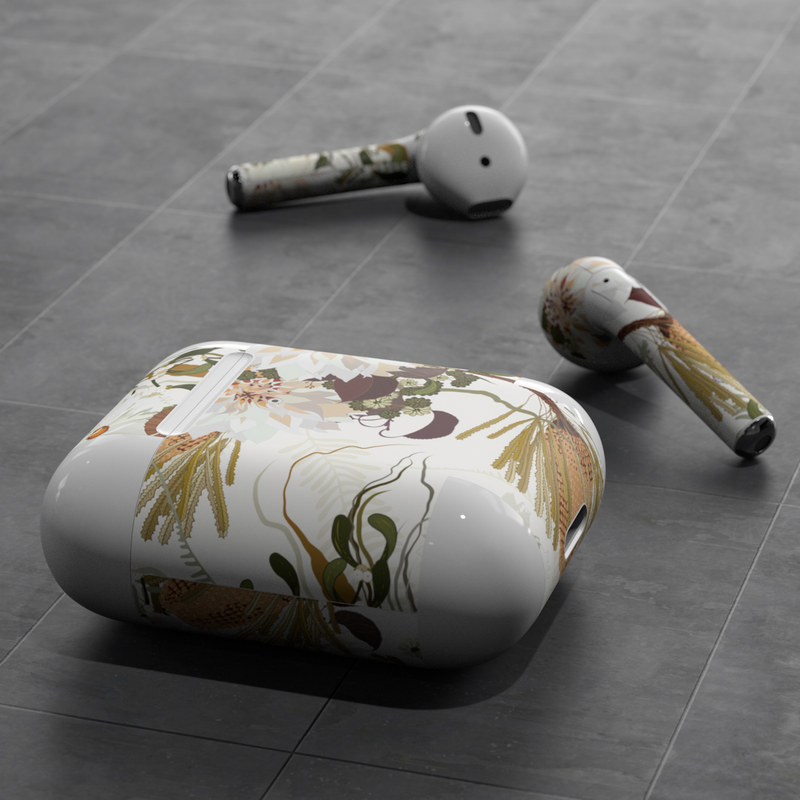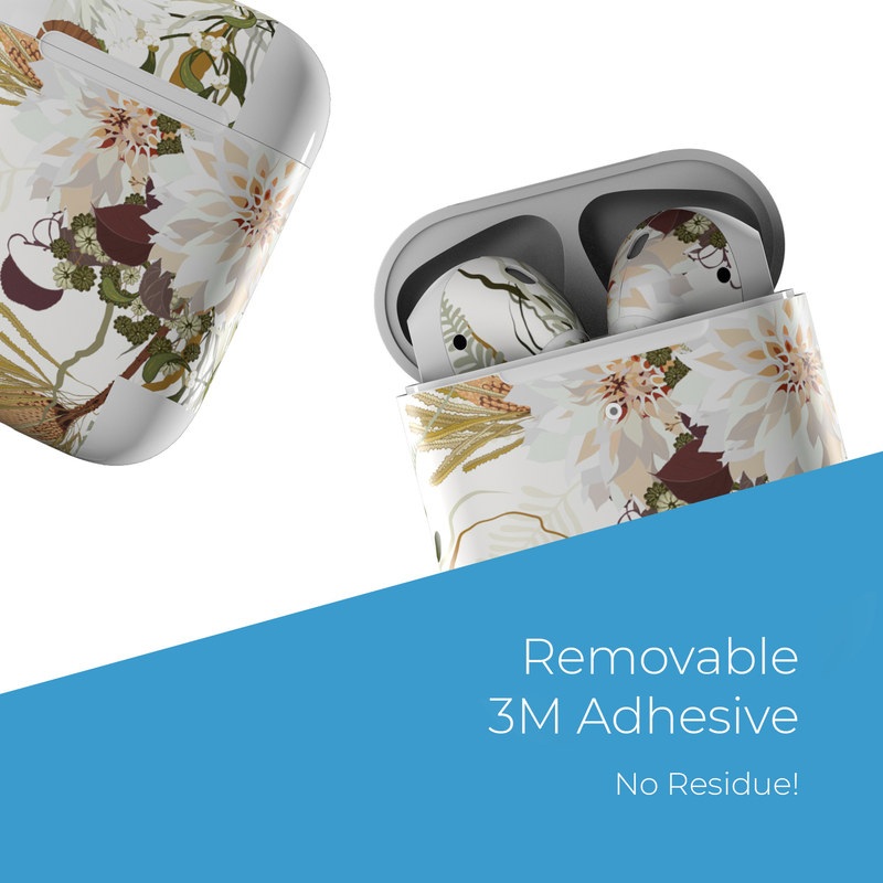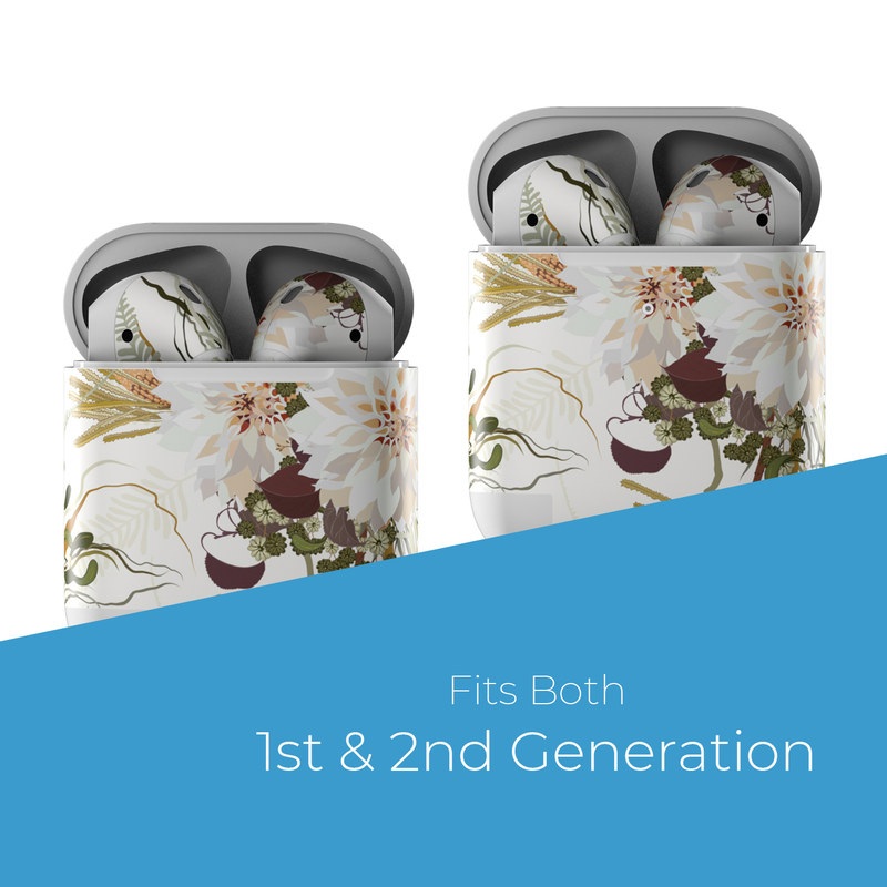 iStyles Apple AirPods Skin design of Flower, Botany, Plant, Floral design, Wildflower, Pattern, Wallpaper, Textile, Petal, Butterfly, with white, brown, green, gray colors, and tagged with nature, patterns, flowers, brown, cream, filigree, floral, flower, flowers, green, leaf, leaves, nature, neutral, outdoor.