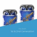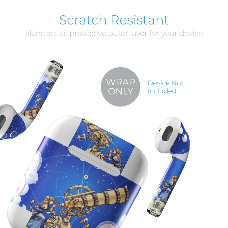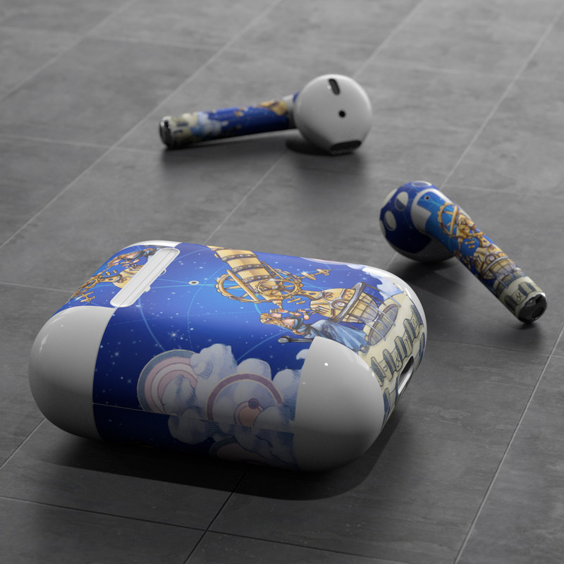 iStyles Apple AirPods Skin design of Circle, World, Space, Vehicle, Satellite, Illustration, with white, blue, yellow, pink, gray colors, and tagged with people, objects, space, astrology, microscope, outerspace, space, stars.