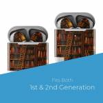 iStyles Apple AirPods Skin design of Shelving, Library, Bookcase, Shelf, Furniture, Book, Building, Publication, Room, Darkness, with black, red colors, and tagged with fineart, objects.