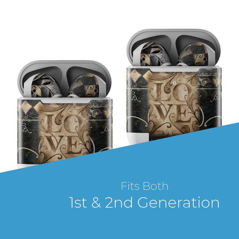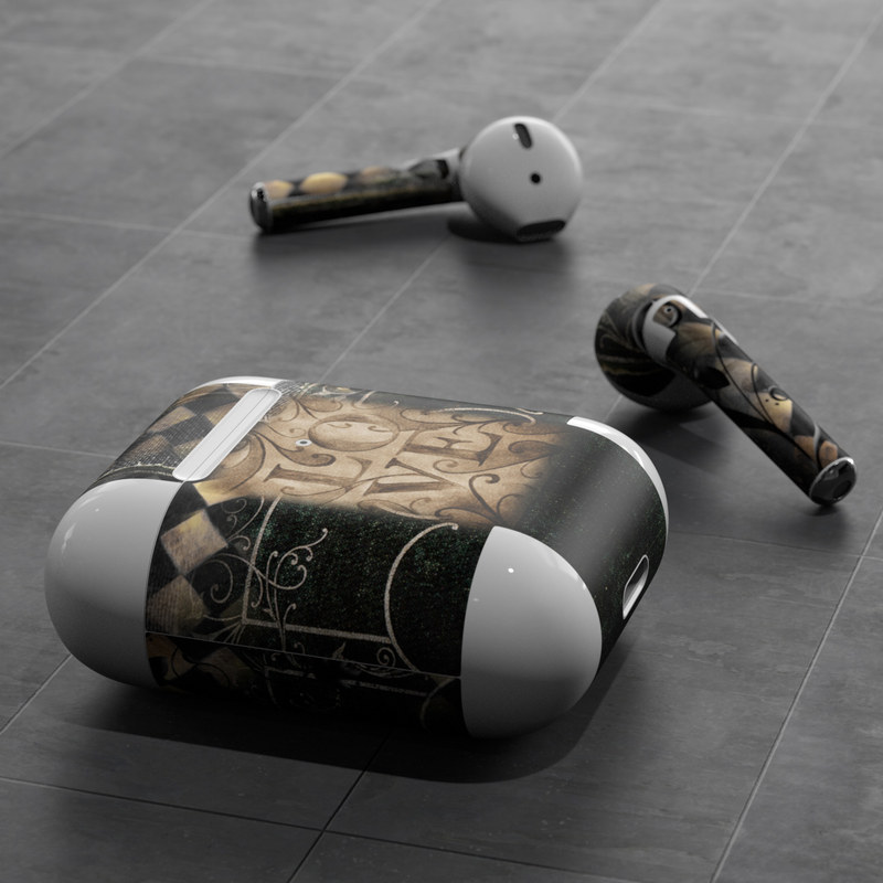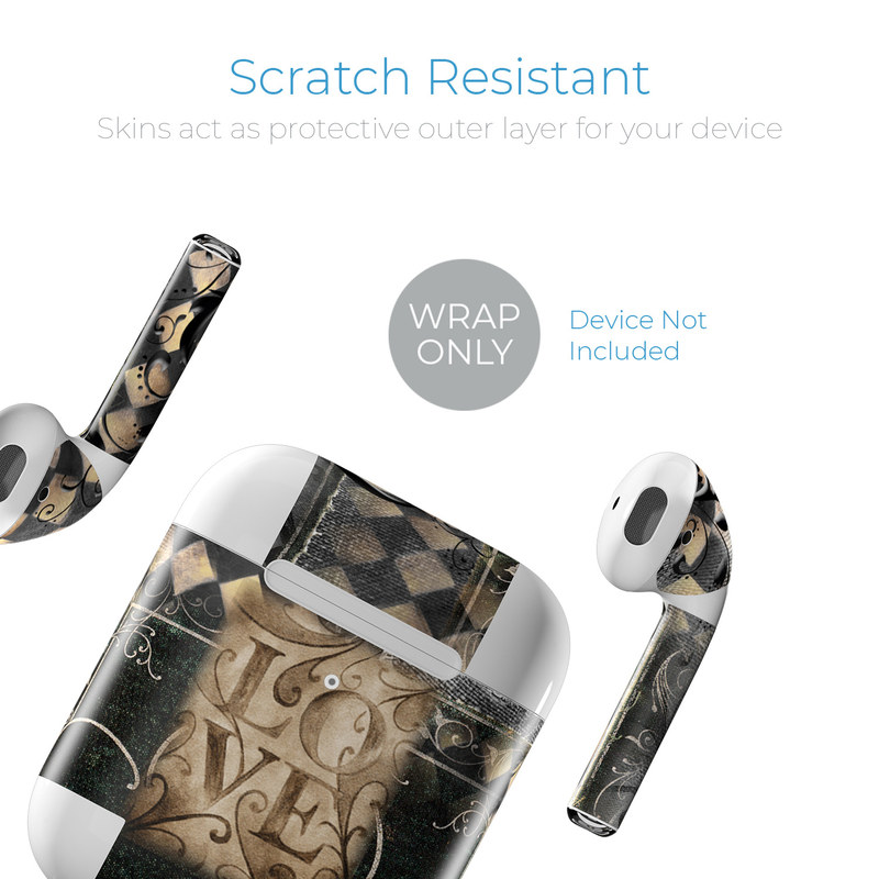 iStyles Apple AirPods Skin design of Pattern, Brown, Design, Textile, Art, with black, gray, green, red colors, and tagged with patterns, hearts.
