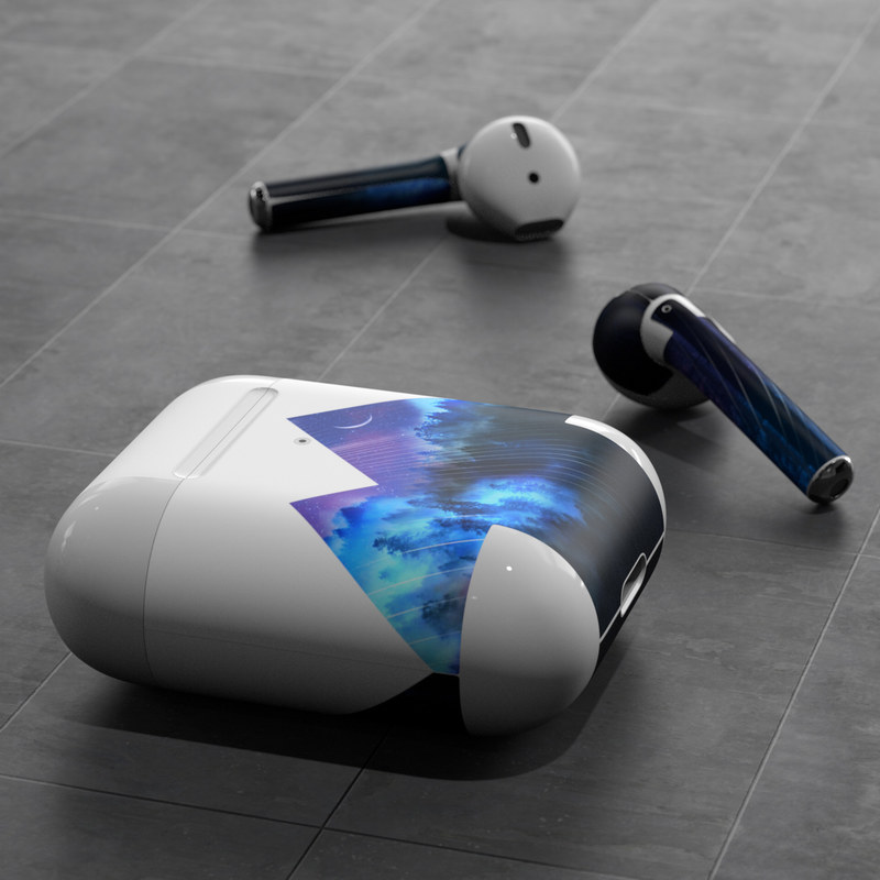 iStyles Apple AirPods Skin design of Blue, Cobalt blue, Pyramid, Pattern, Electric blue, Design, Fractal art, Sky, Triangle, Space, with white, blue, purple, black colors, and tagged with nature, objects, space, signs, earth, geometry, moon, mountains, nature, plants, space, stars, trees, water.