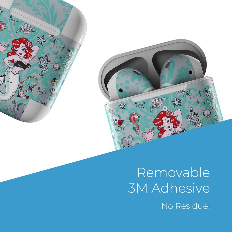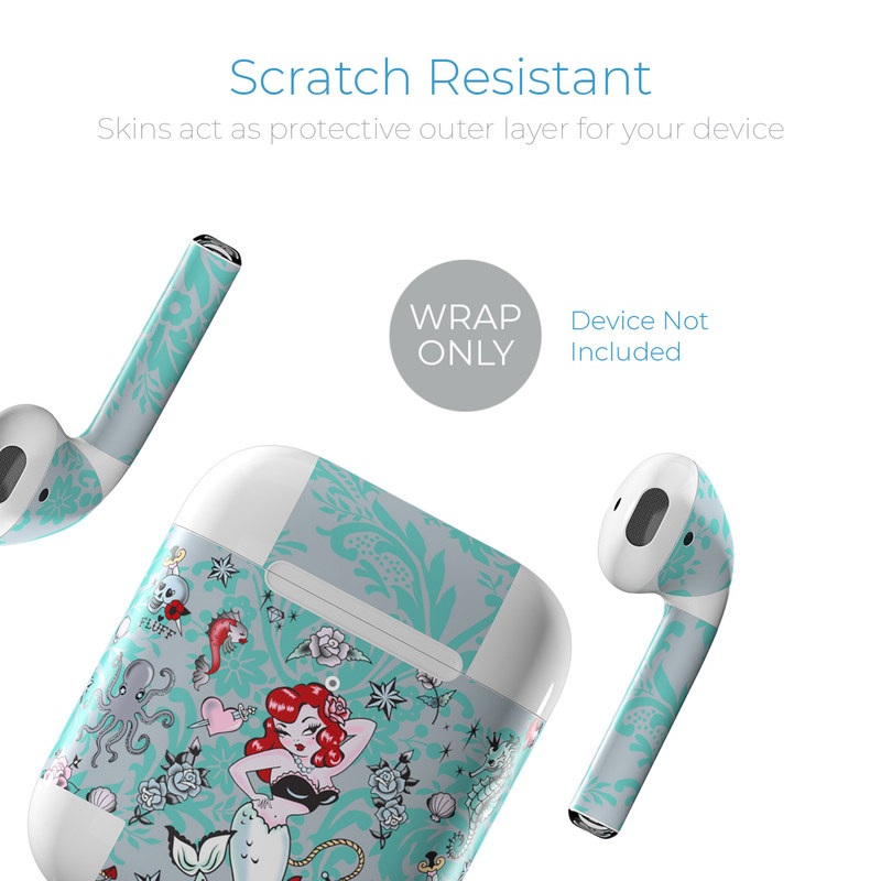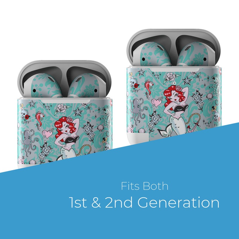 iStyles Apple AirPods Skin design of Mermaid, Illustration, Fictional character, Organism, Art, Pattern, Style, with gray, blue, black, red, white, pink colors, and tagged with patterns, objects, hearts, people, animals.