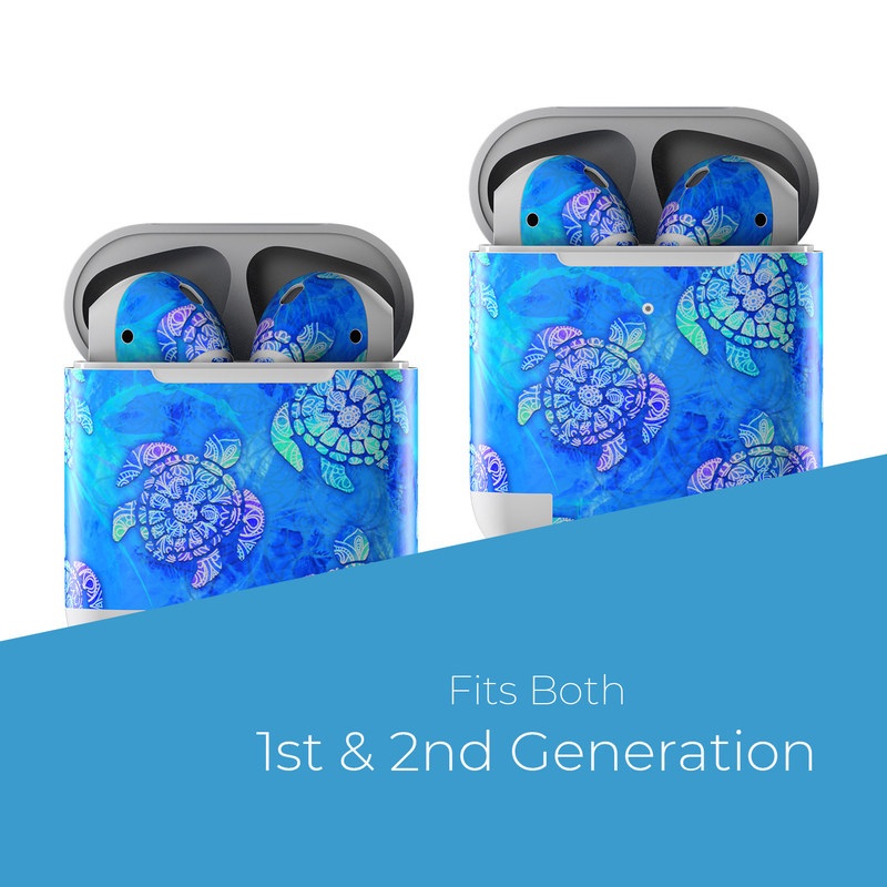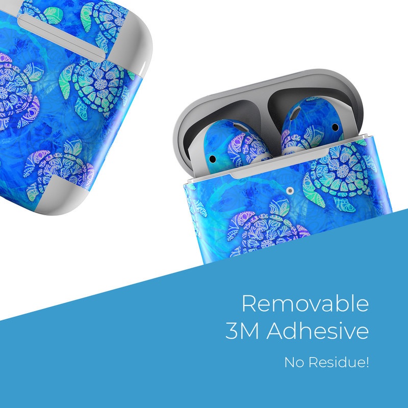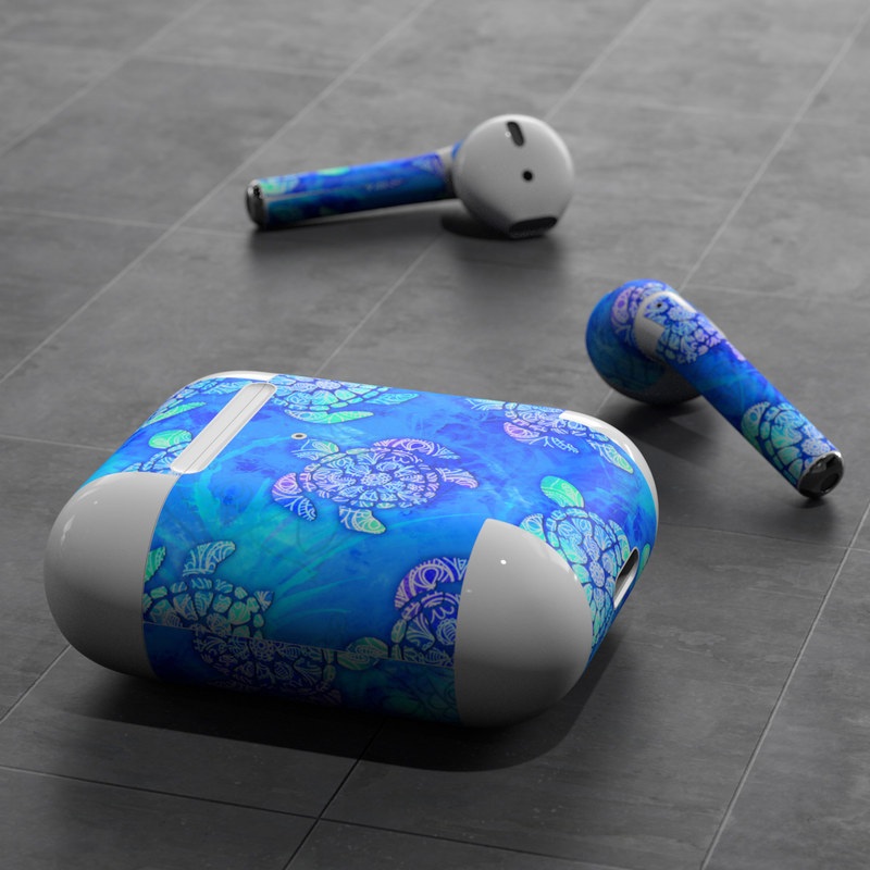 iStyles Apple AirPods Skin design of Blue, Pattern, Organism, Design, Sea turtle, Plant, Electric blue, Hydrangea, Flower, Symmetry, with blue, green, purple colors, and tagged with patterns, animals, flower, nature, sealife, turtle, turtles, watercolor.
